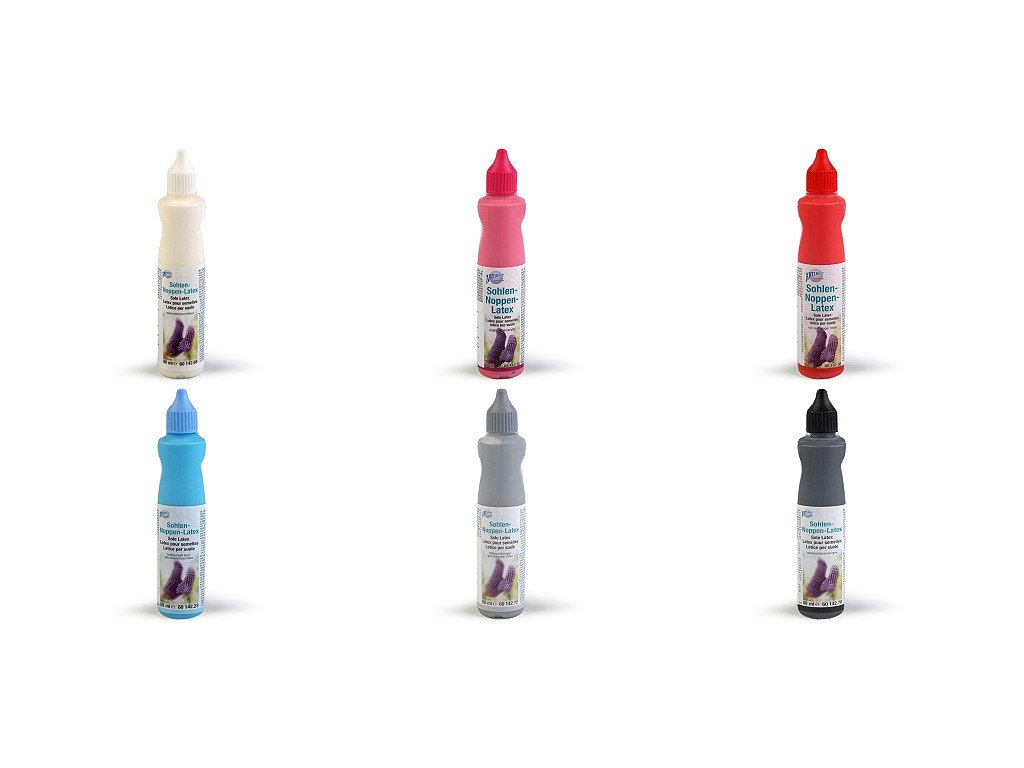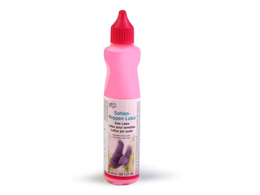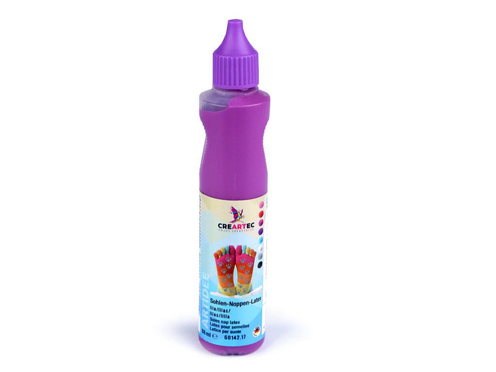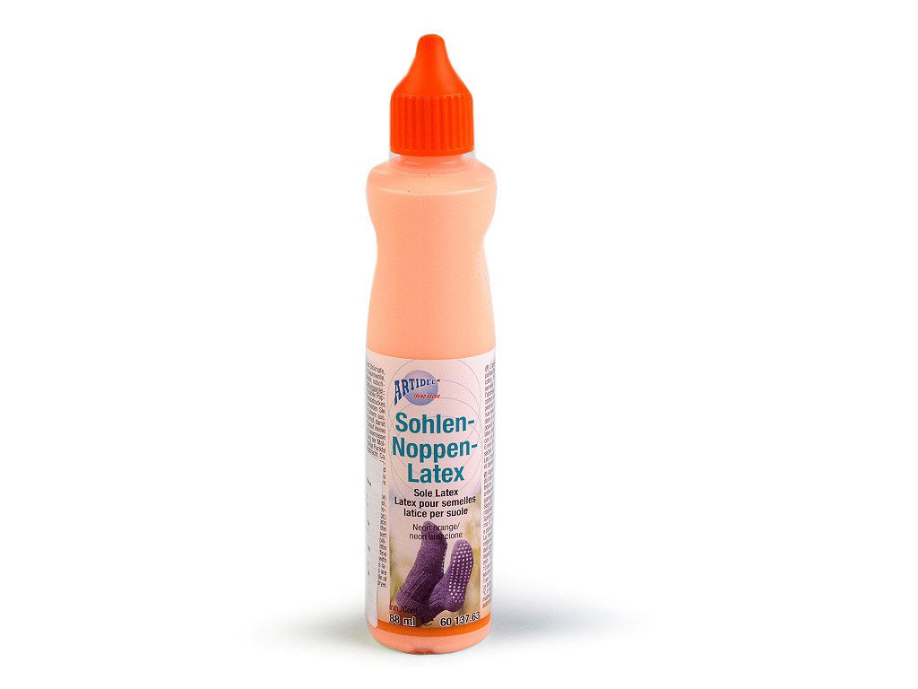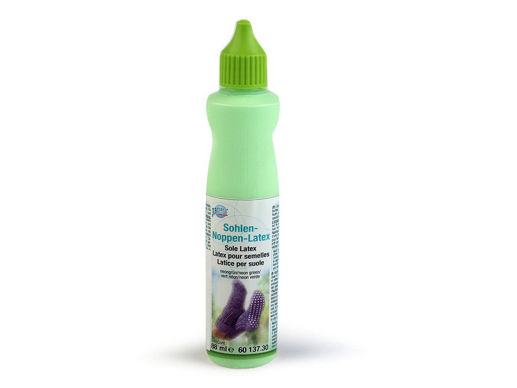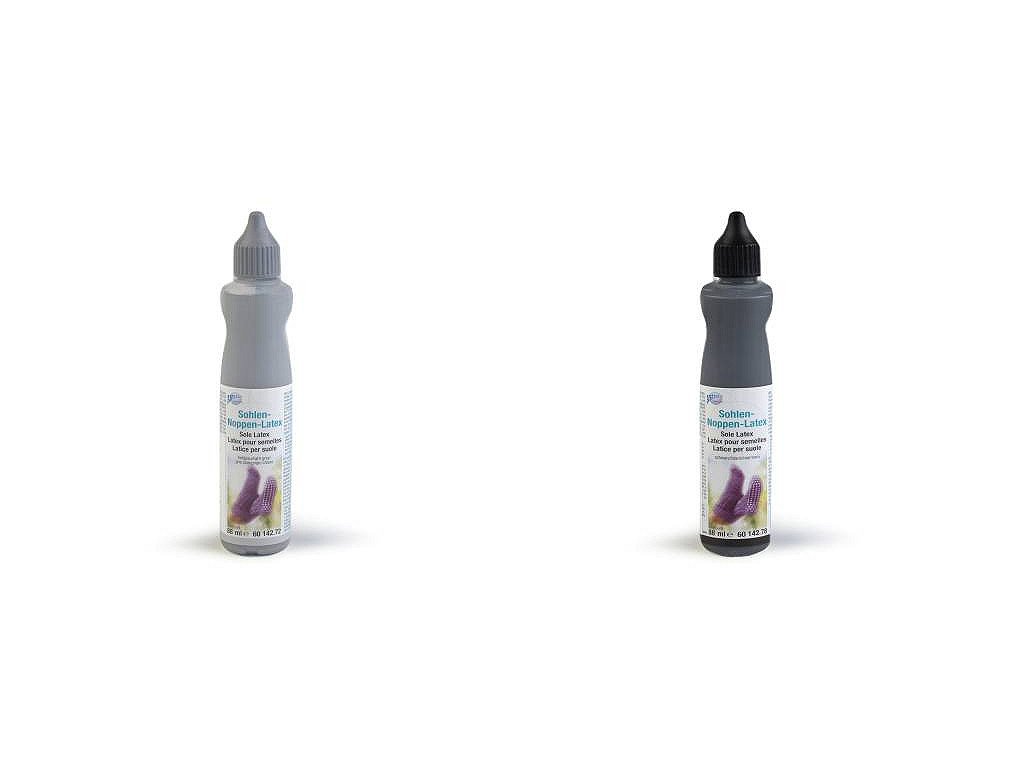 Gumový protiskluz je vhodný na ponožky, předložky, koberečky apod. Plastická barva po zaschnutí zajistí protiskluzový efekt, abyste vy nebo vaše dítě neuklouzli. Nanesením malých teček na ponožky, punčochy a papuče z vlny, bavlny, filcu nebo syntetické tkaniny vznikne robustní protiskluzová a otěruvzdorná gumová podrážka. Návod k použití: položte nohu na pevnou lepenku. Obtáhněte kontury chodidla fixem a otisk vystřihněte nůžkami. Vsuňte lepenku do vybrané ponožky nebo punčochy, aby se vytvořila pevná podrážka a mohli jste na ni nanést malé latexové tečky. Latexová hmota se přímo nanáší tenkým otvorem v trysce na lahvičce. Špičku lahvičky je nutné více zastrčit do látky a pak postupně pomalu vytahovat nahoru, aby se latex dostal přímo do struktury a neulpěl jen na povrchu vláken. Vytvářejte malé puntíky v rozmezí 5-6 mm. Doba schnutí je 8-10 hodin. Poté vyjměte lepenku. Ponožky či punčochy jsou pak ihned připraveny k použití. Nástroje očistěte vodou, znečistěné textilie a plochy ihned omyjte vodou. Můžete prát do max. 40°C, nepoužívejte sušičku.- Obsah: 88; 100 ml