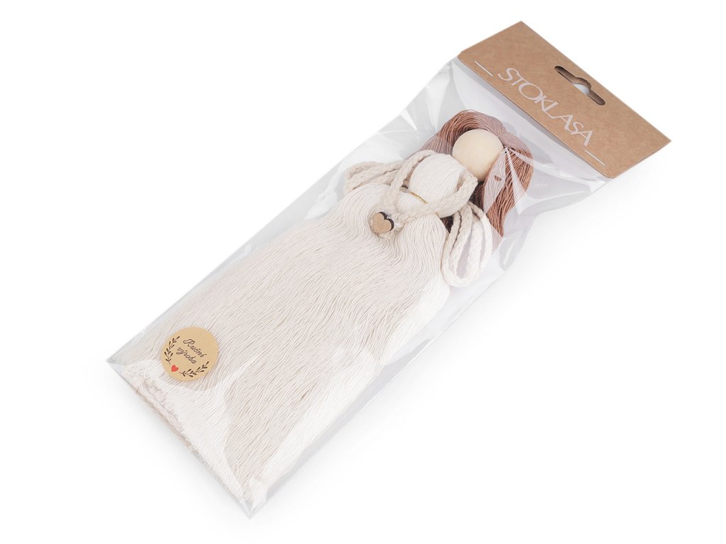 Dekorační andělka je ručně vyrobená technikou macrame. Je velice působivá i díky použitých přírodních materiálů. Nahoře má poutko na zavěšení. Andělka bude milým dárkem k nejrůznějším příležitostem. Vlásky i sukýnku můžete jemně učesat rovným hřebenem.- Šířka: cca 9 cm