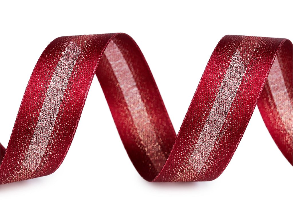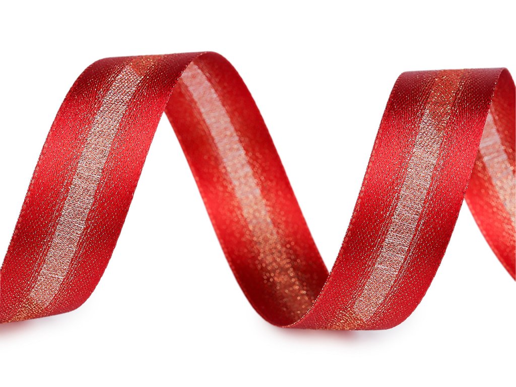 Dekorační atlasová stuha je uprostřed ozdobená lurexovým pruhem, díky kterému se poutavě třpytí. Stuha má pevné okraje, je oboustranná. Použití: bude se perfektně vyjímat u vánočních dekorací, můžete ji použít na různé věnce, vazby nebo s ní originálně zabalit dárky. Je pevná, uvázané mašle pěkně drží tvar.- Šíře: 25 mm