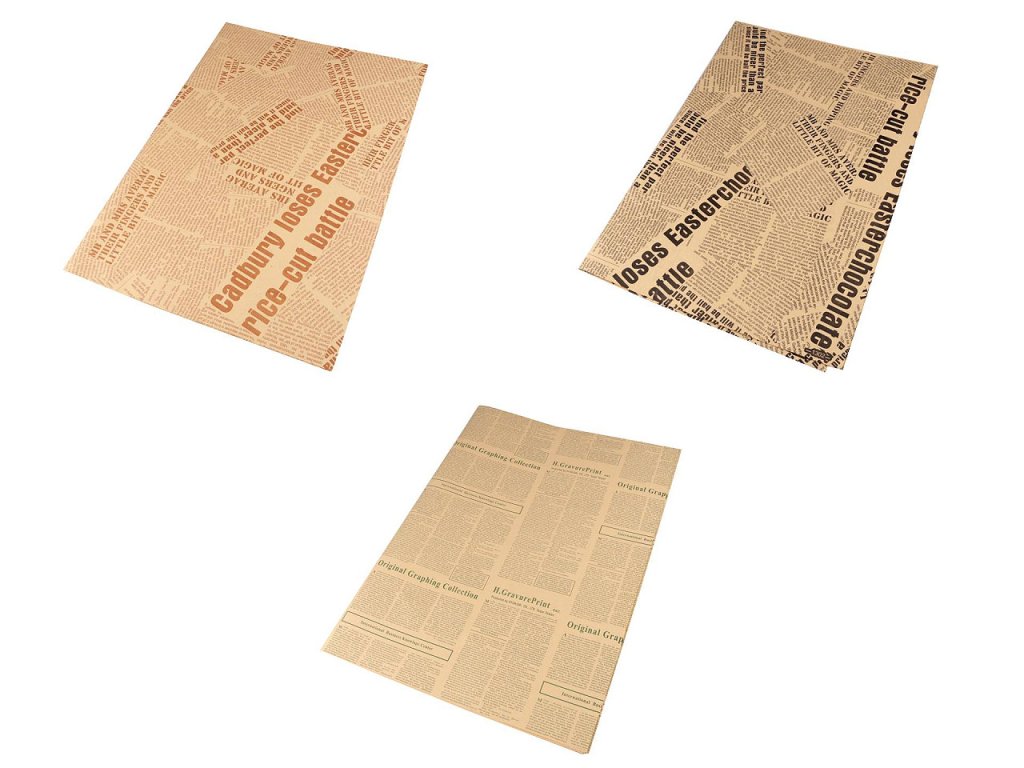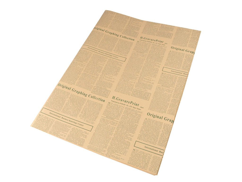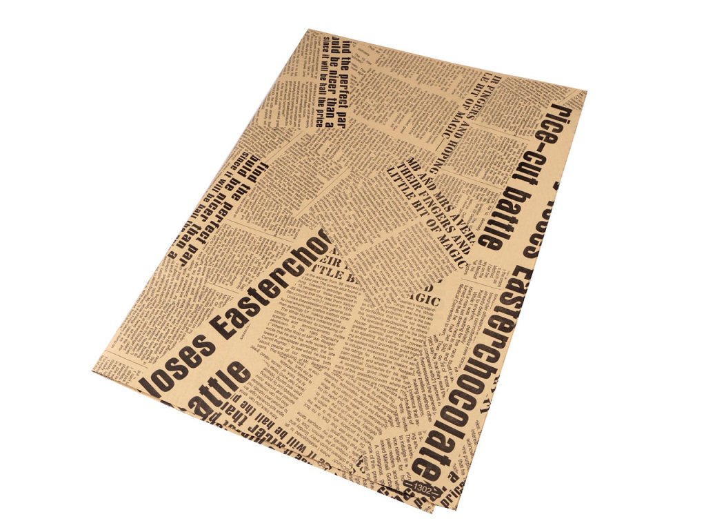Dekorační papír s novinovým potiskem si zamilují příznivci vintage stylu. Potisk je oboustranný - obě strany mají stejnou barvu. Papír využijete k výrobě prostírání, kornoutů, k balení dárků i na scrapbooking, kde s ním můžete ozdobit pozvánky, přání, deníky, krabičky apod. Floristé jej používají na ozdobné manžety uvázaných pugétů kytic.- Rozměry: 50 x 75 cm