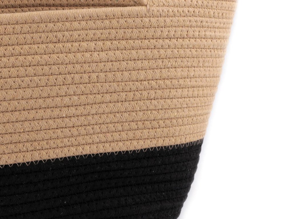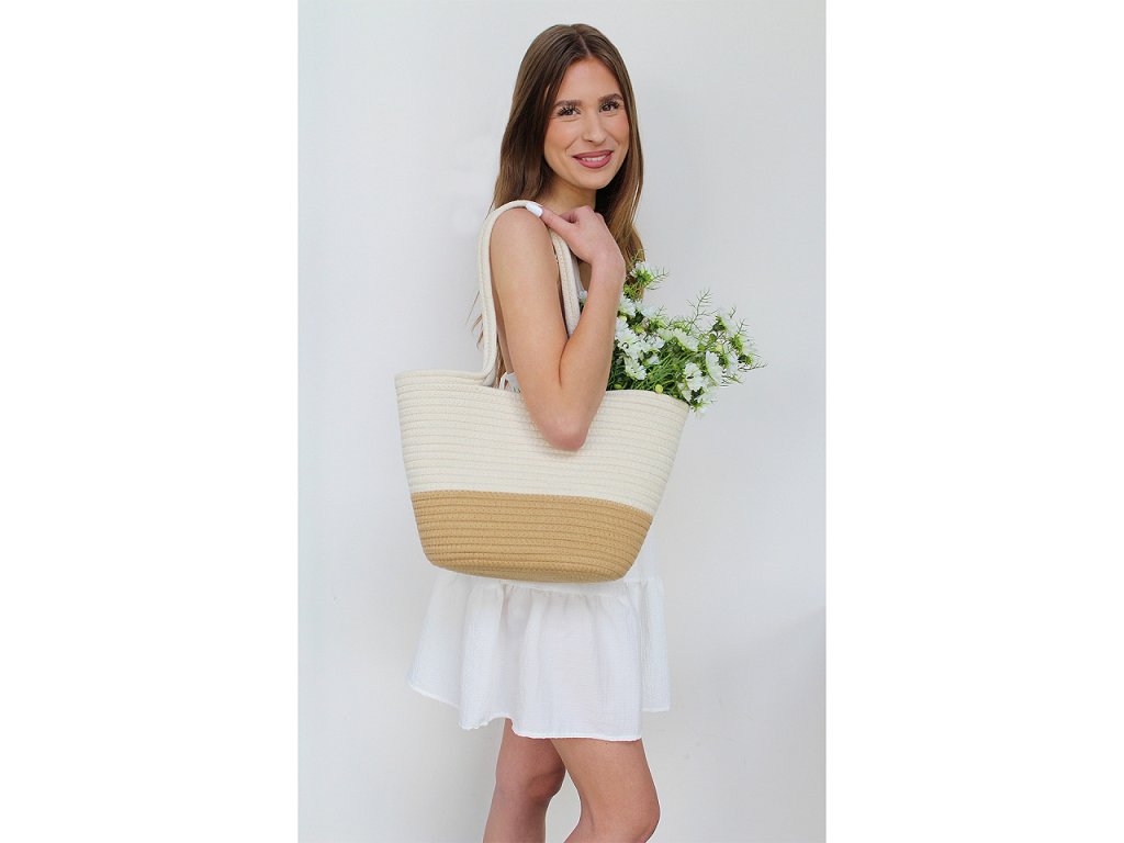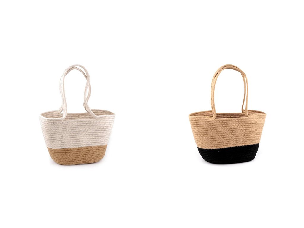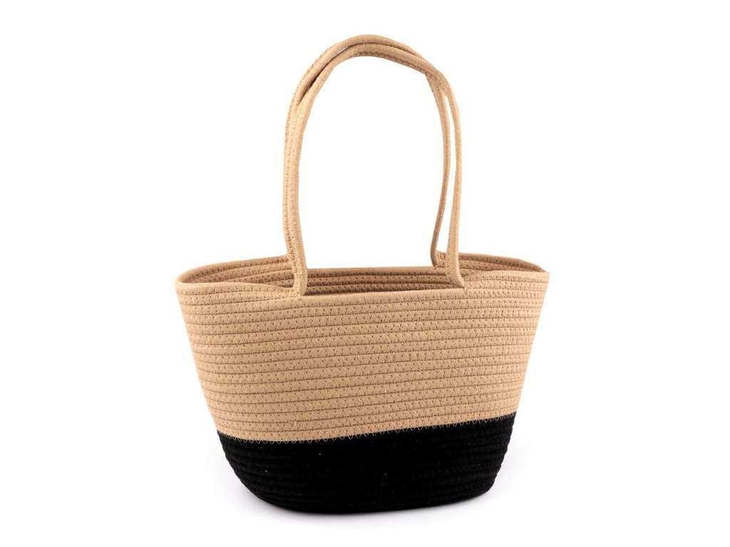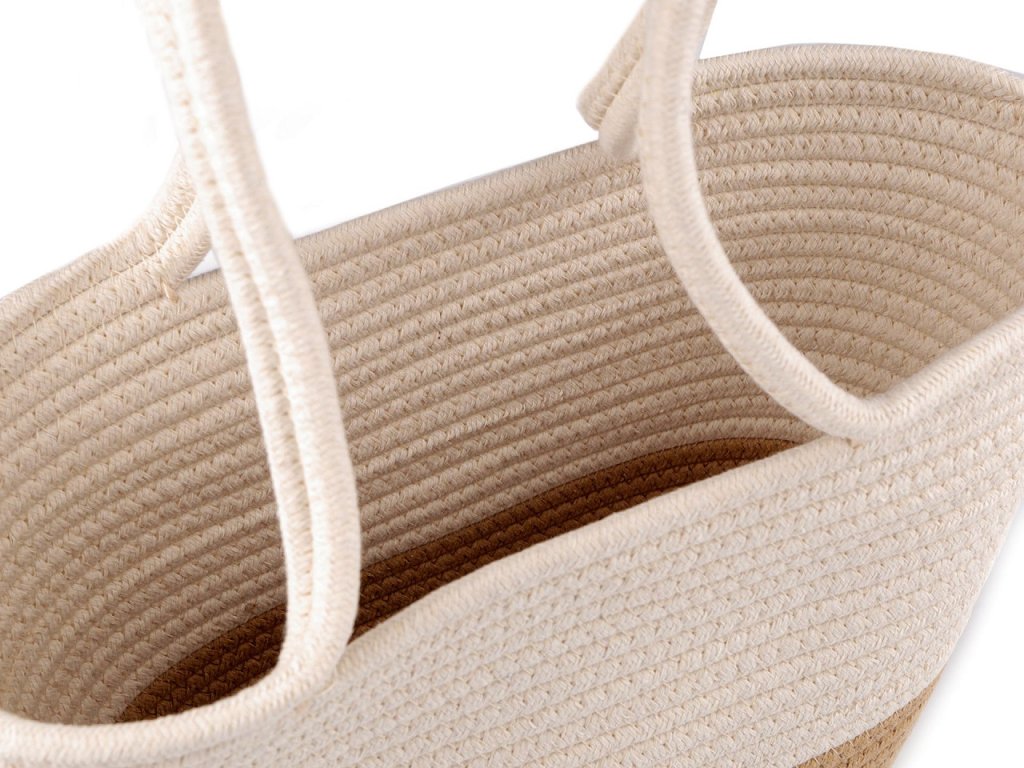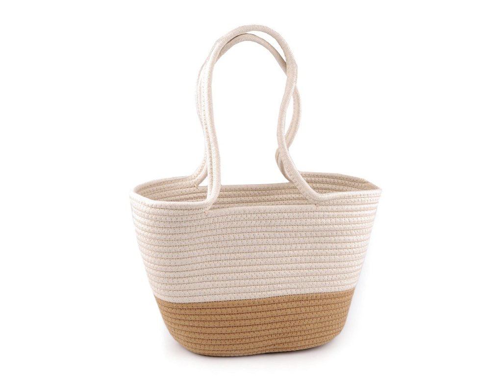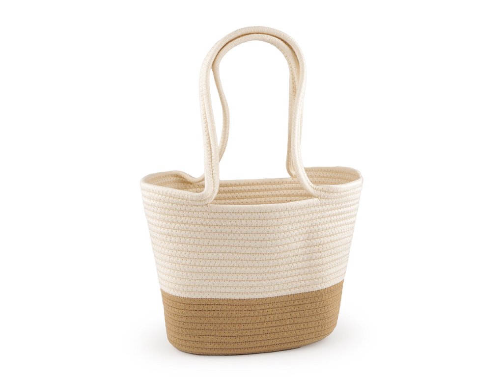 Z prostorné bavlněné kabelky budete nadšení. Vynosíte ji do města, vejde se do ní i menší nákup, hodí se i na piknik v přírodě apod. Má zajímavou strukturu, která vznikla sešitím bavlněné šňůry dokola. Dno je oválné, ucha jsou na nošení v ruce.