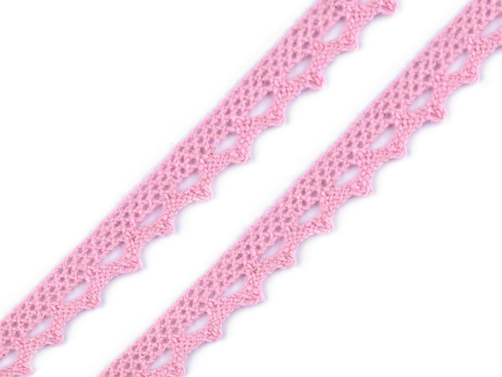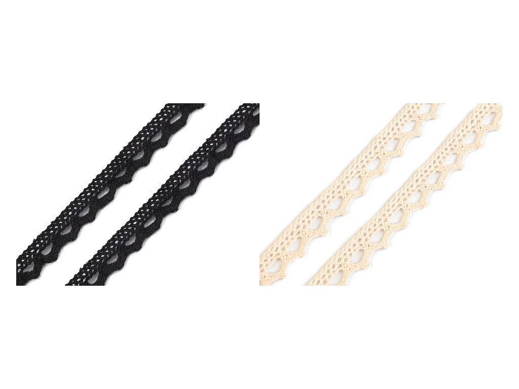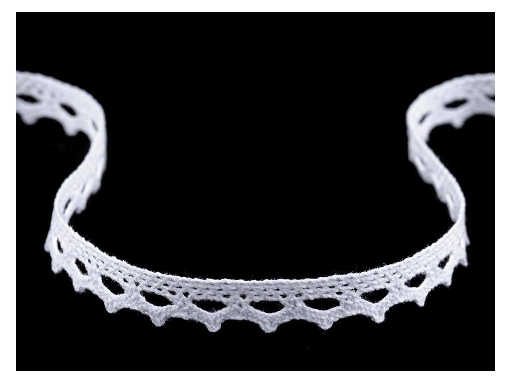 Pevná krajka je vyrobená z bavlny. Zdobí ji jemný paličkovaný vzor s drobnými očky. Použití: Krajka se nejčastěji používá k olemování ubrusů, prostírání, polštářů, deček a oděvů, například halenek. Využijete ji i v technice scrapbooking na zdobení přáníček, krabiček nebo pozvánek. Krajka může mít v návinu 2 až 4 prostřihy. Šíře krajky se po konečné úpravě může lišit o ±6%.- Šíře: 11 mm