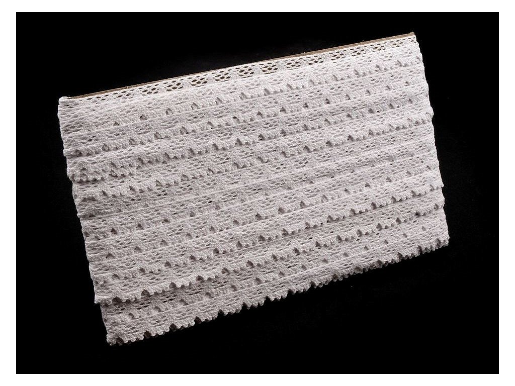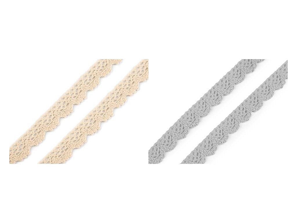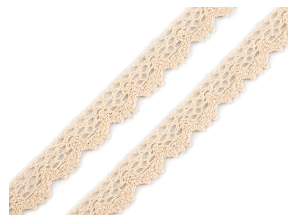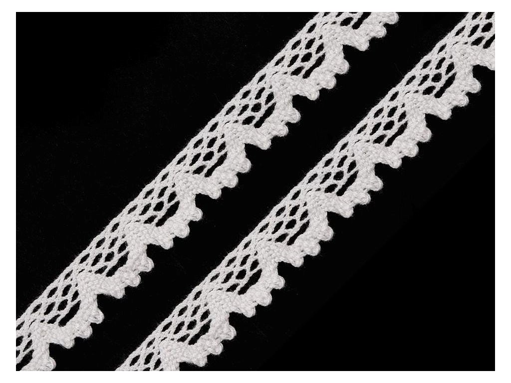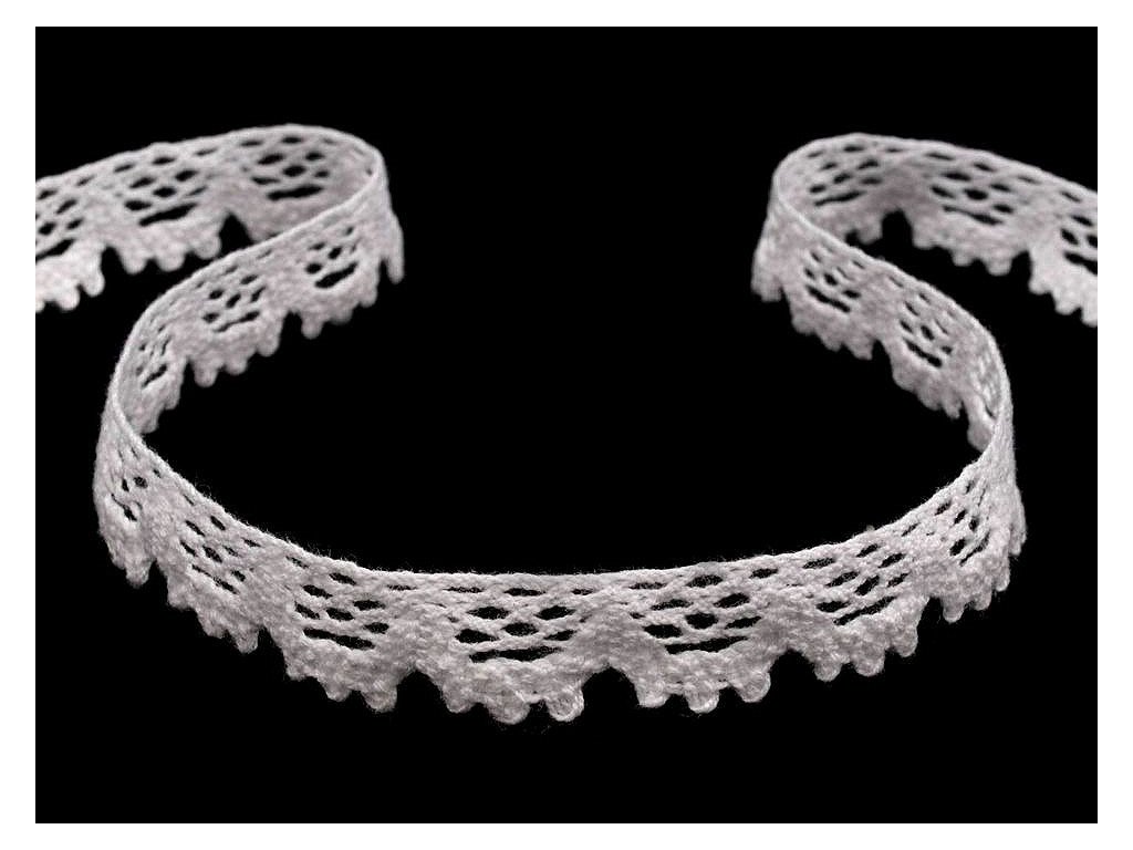 Bavlněná krajka je zajímavá svým originálním paličkovaným vzorem, který je z jedné strany zakončený zoubky. Použití: Krajku můžete použít na olemování ubrusů, deček, šatů či halenek. Je vhodná také na výrobu přáníček, pozvánek nebo ozdobení krabiček. Krajka může mít v návinu 2 až 4 prostřihy. Šíře krajky se po konečné úpravě může lišit o ±6%.- Šíře: 14 mm