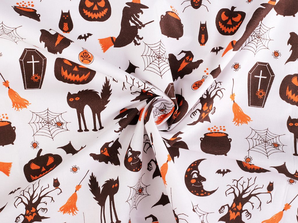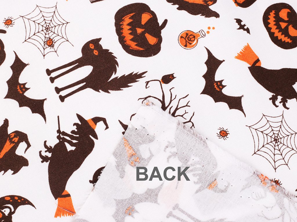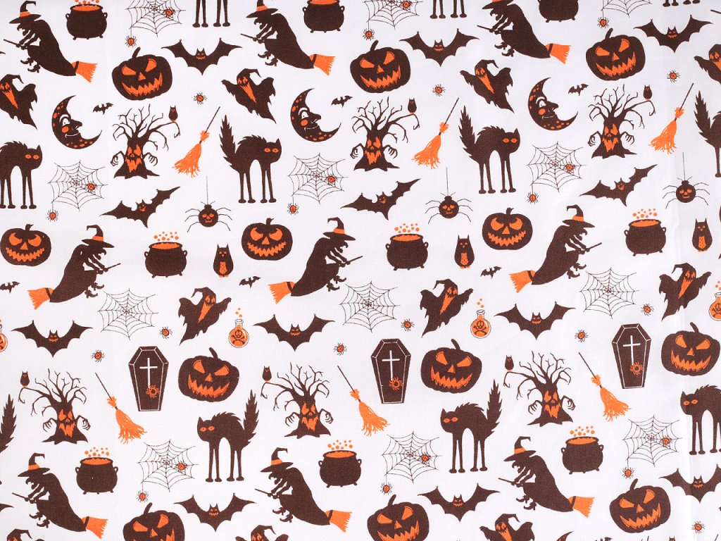 Bavlněné plátno se díky svému designu hodí na šití halloweenských dekorací a bytových doplňků. Motiv zahrnuje klasické halloweenské prvky jako jsou dýně, čarodějnice, netopýři a další tematické dekorace. Z látky můžete ušít stylové polštáře, ubrusy, prostírání, povlečení, závěsy, tašky, pytlíky apod.- Gramáž: 110 g/m²