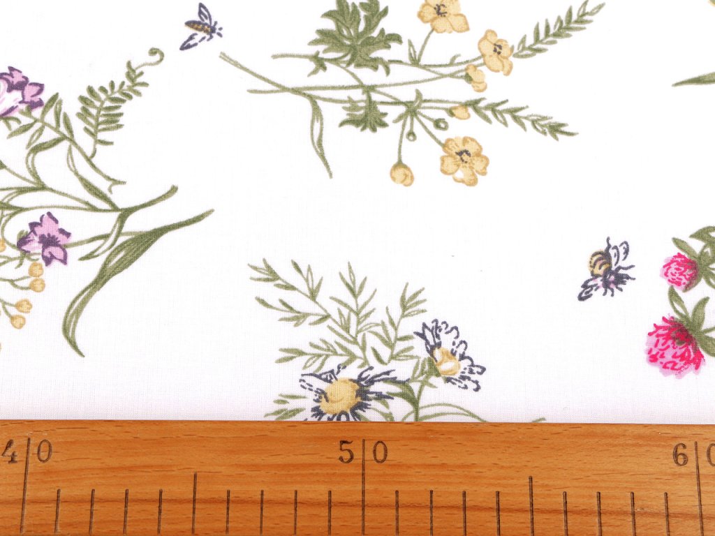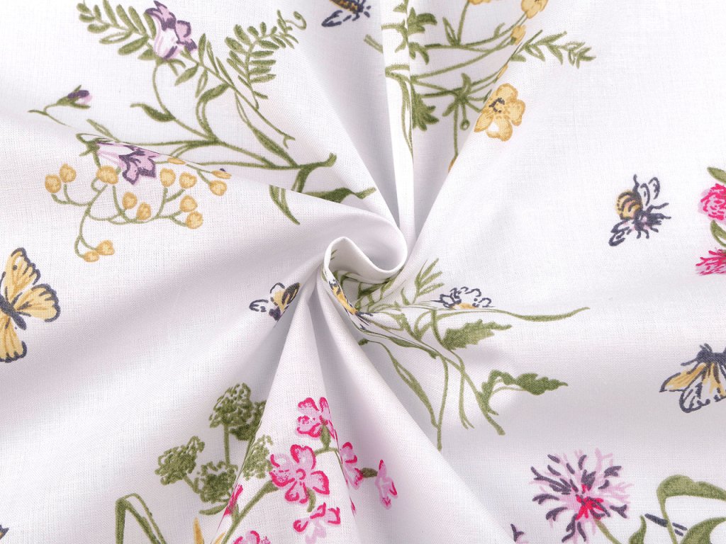Bavlněnou látku zdobí jemný potisk polního kvítí, který přinese pocit svěžesti a přírody do každého interiéru. Využijete ji na šití povlečení, polštářů, závěsů, ubrusů, tašek, pytlíků a různých bytových dekorací a doplňků.- Gramáž: 110 g/m²