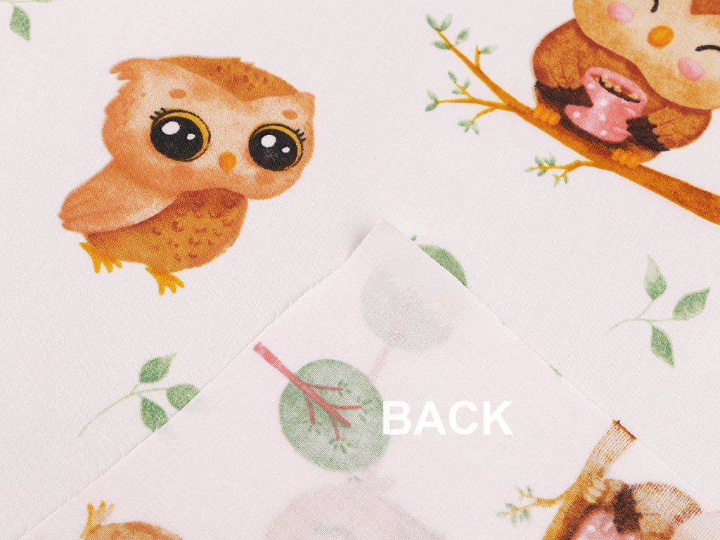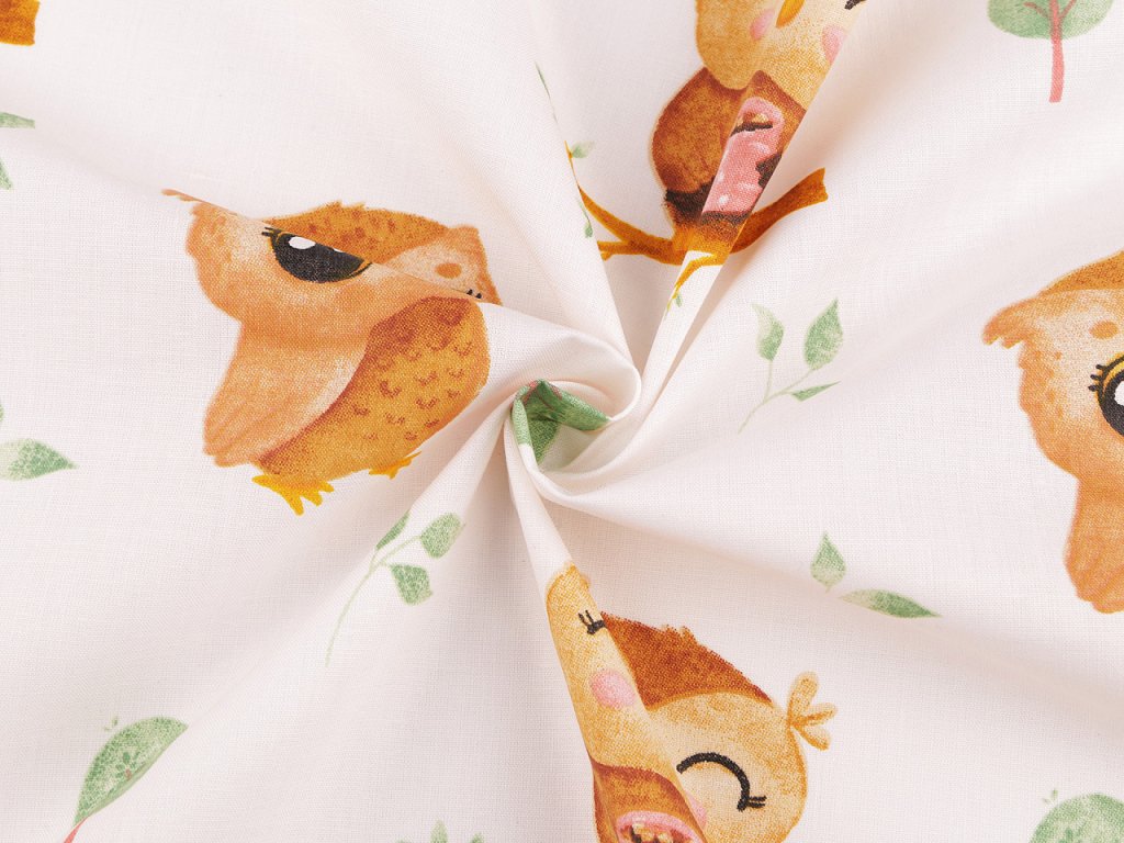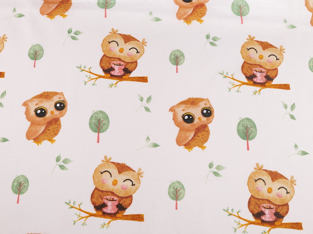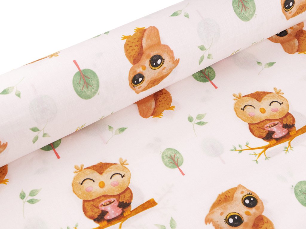 Bavlněnou látku využijete na šití polštářů, dětského povlečení, závěsů, pytlíků, tašek nebo kapsářů. Zdobí ji obrázky roztomilých soviček.- Gramáž: 115 g/m²