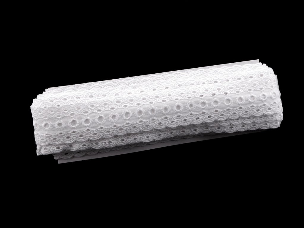 Symetrická bavlněná madeira je zdobená dírkovanou výšivkou a lemovanými okraji. V jejím středu jsou větší dírky (cca Ø5 mm), kterými můžete provléct stuhu, šňůrku či gumu. Využijete ji na zdobení oděvů, dětských peřinek, zavinovaček, polštářů, ubrusů i lidových krojů. Šíře nevyšité části se může mírně lišit (±10%).- Šíře: 40 mm