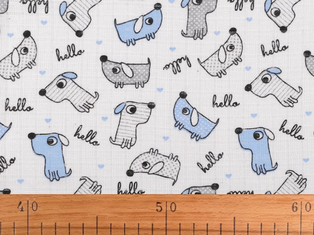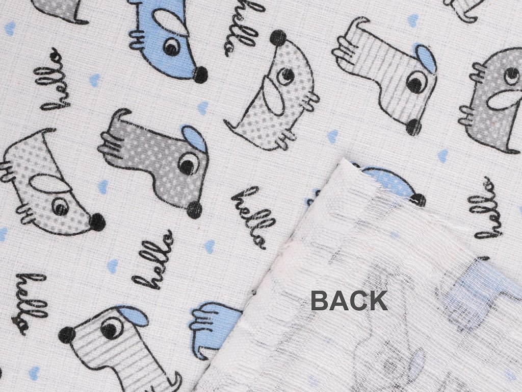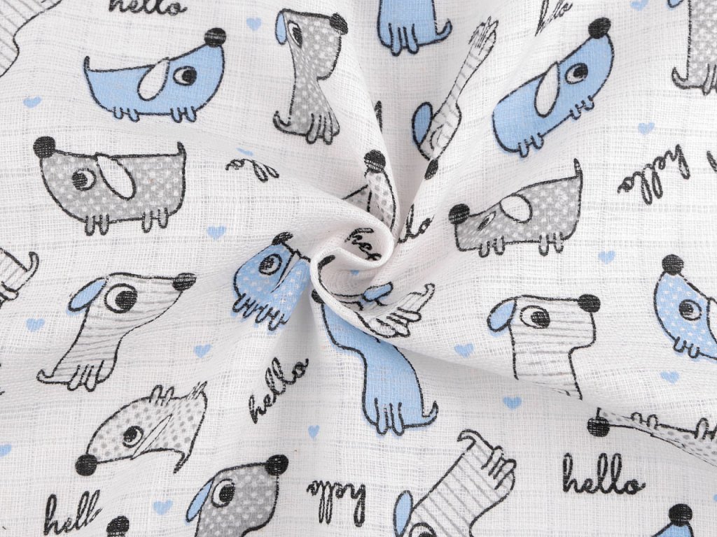 Bavlněnou plenkovinu využijete na šití plenek, baldachýnů, bryndáčků apod. Je prodyšná, příjemná na dotek. Zdobí ji potisk s pejsky. Plenkovina se skládá ze dvou vrstev.- Gramáž: 120 g/m²