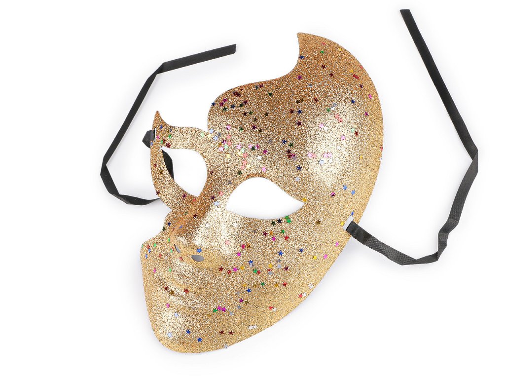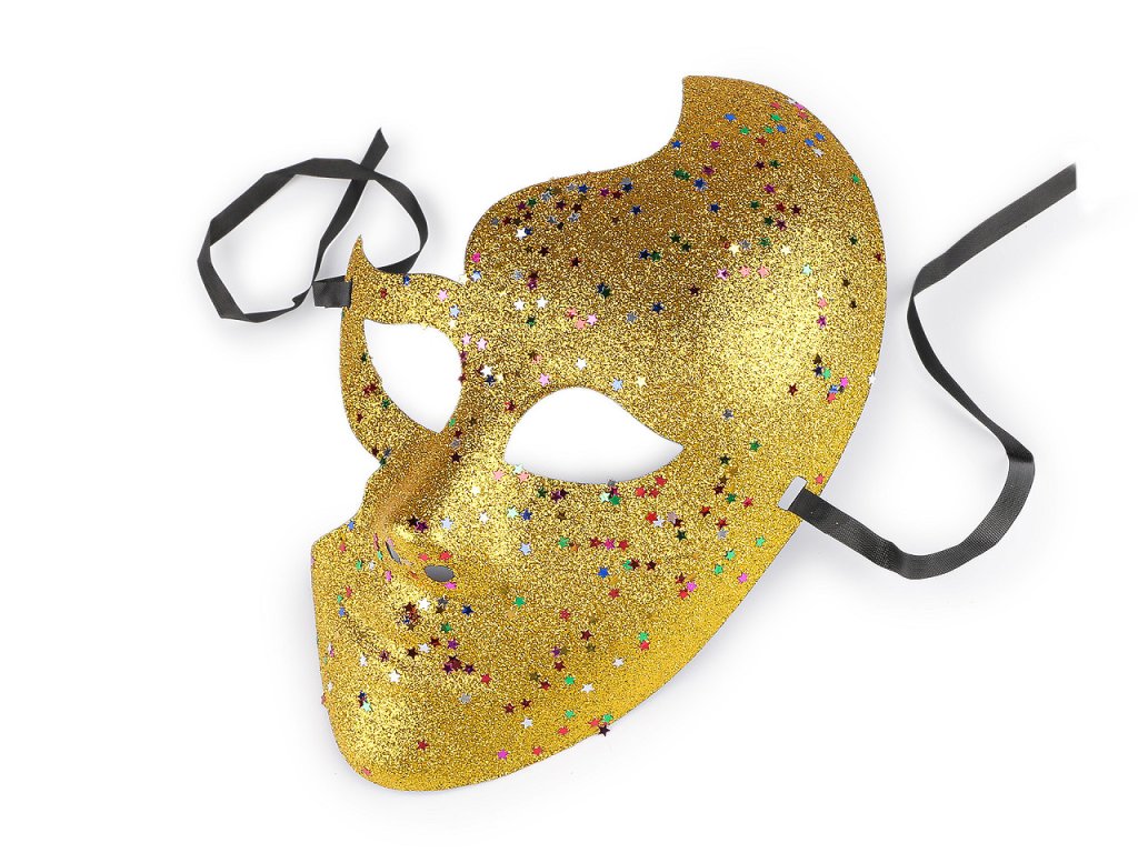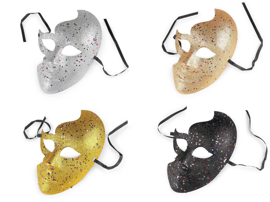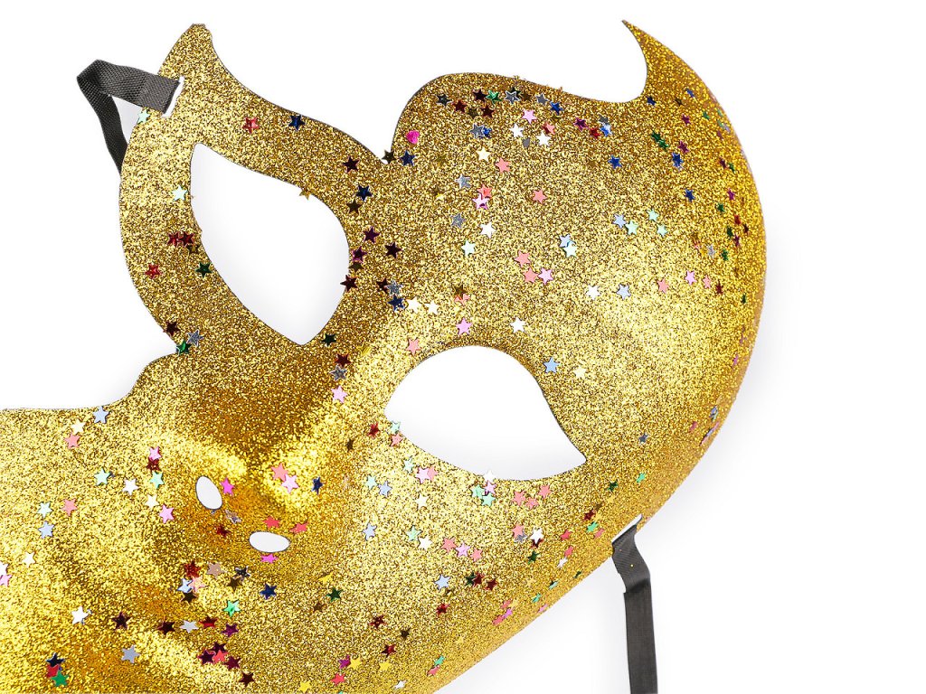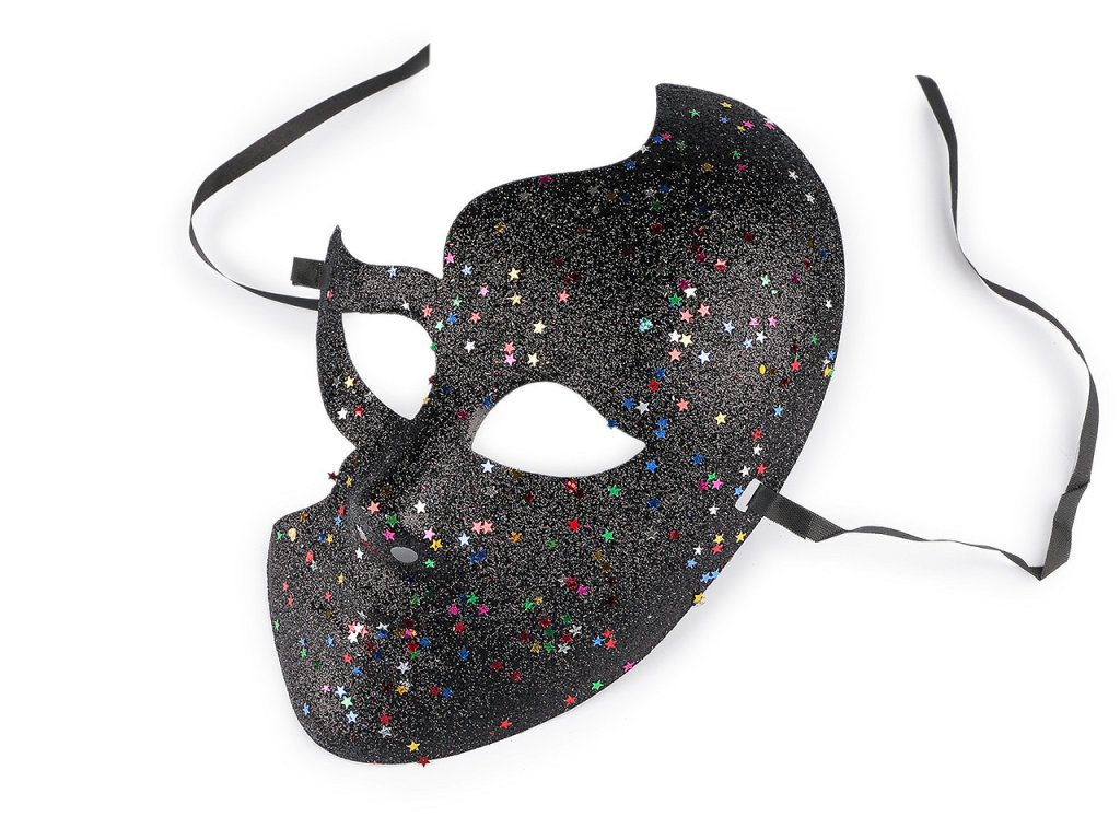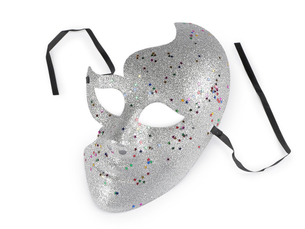 Benátskou masku využijete na různé večírky, plesy, párty, karnevaly i divadelní představení. Přidá mystiku vašemu vzhledu. Celá je pokrytá třpytivými glitry a drobnými flitry ve tvaru hvězd. Zavazuje se pomocí stuhy.- Šířka: 17 cm