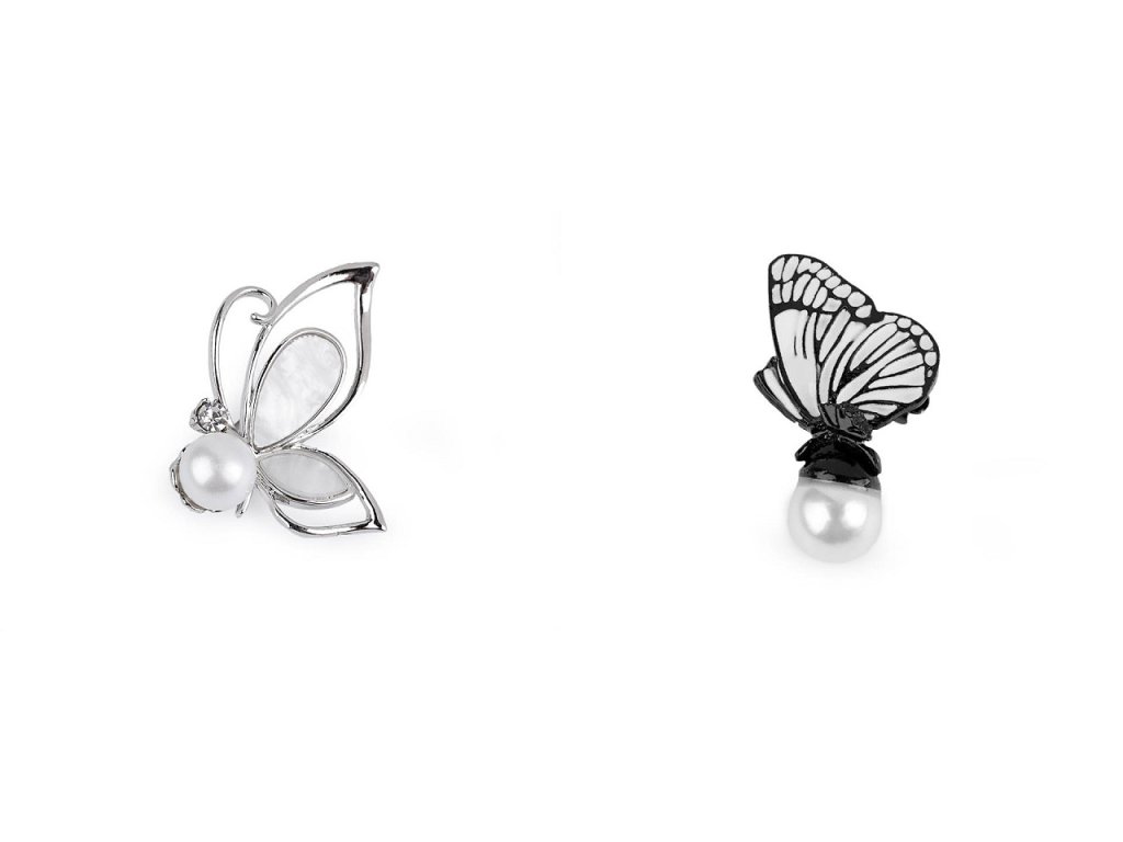 Brož motýla s perlou je elegantním doplňkem, který upoutá pozornost a přinese nádech luxusu do vašeho outfitu. Je skvělým doplňkem pro slavnostní události, jako jsou svatby či večírky, zároveň ji můžete nosit i v běžných dnech pro oživení vašeho každodenního stylu. Zapíná se pomocí brožového špendlíku. Brož č.1 a 2 je ozdobená imitací perleti, hlavičku zdobí broušený kamínek, který se krásně třpytí. Brož č.3 je ozdobená barevným smaltem. Brož můžete nosit nejen na oděvech, ale hodí se i k ozdobení klobouků, tašky či sepnutí šátku. Je na plastové kartě, která se dá zavěsit na prodejní stojan.- Rozměry: č. 1 a 2: 2,8 x 3,6 cm