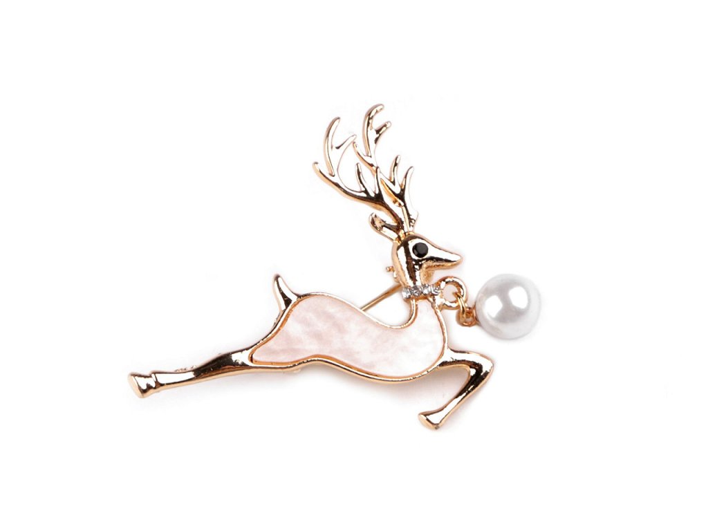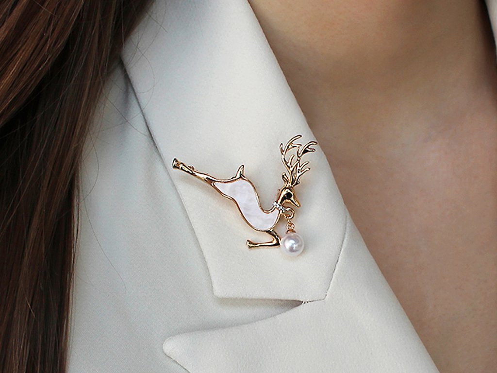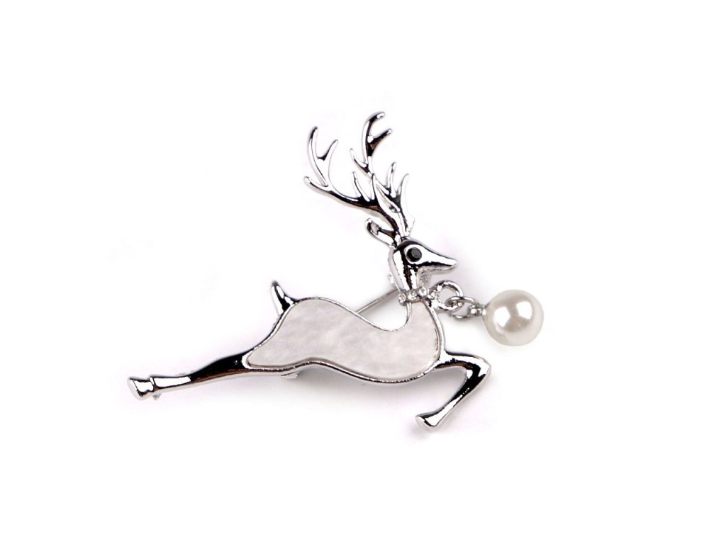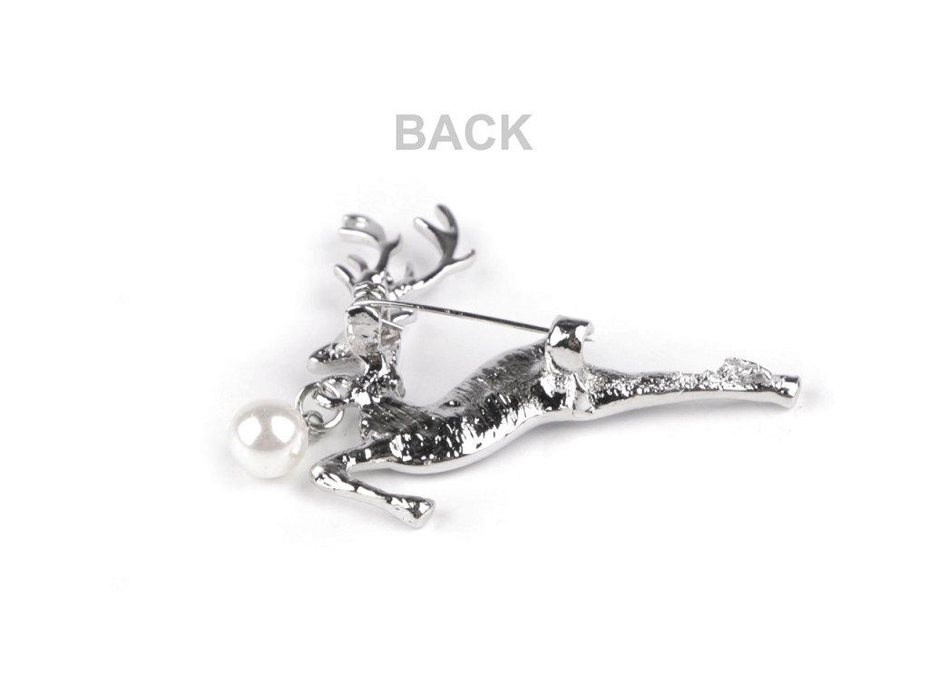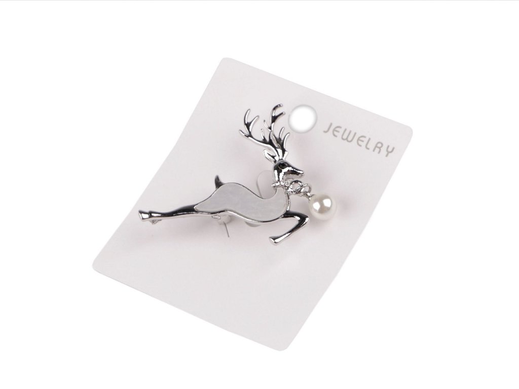 Elegantní brož s jelenem bude perfektním doplňkem vašeho oděvu. Je ozdobená perlou a imitací perleti. Díky broušeným kamínkům v oku a okolo krku se jemně třpytí, skvěle dozdobí košile, saka, svetry, kabelky či čepice. Hodí se i na ozdobné sepnutí šátku. Brož má vzadu brožový špendlík. Je na plastové kartě, která se dá zavěsit na prodejní stojany.- Rozměry: 4 x 4,5 cm