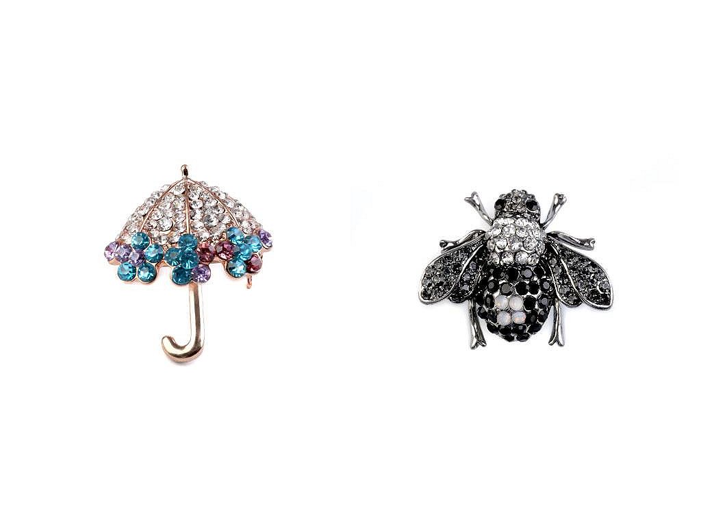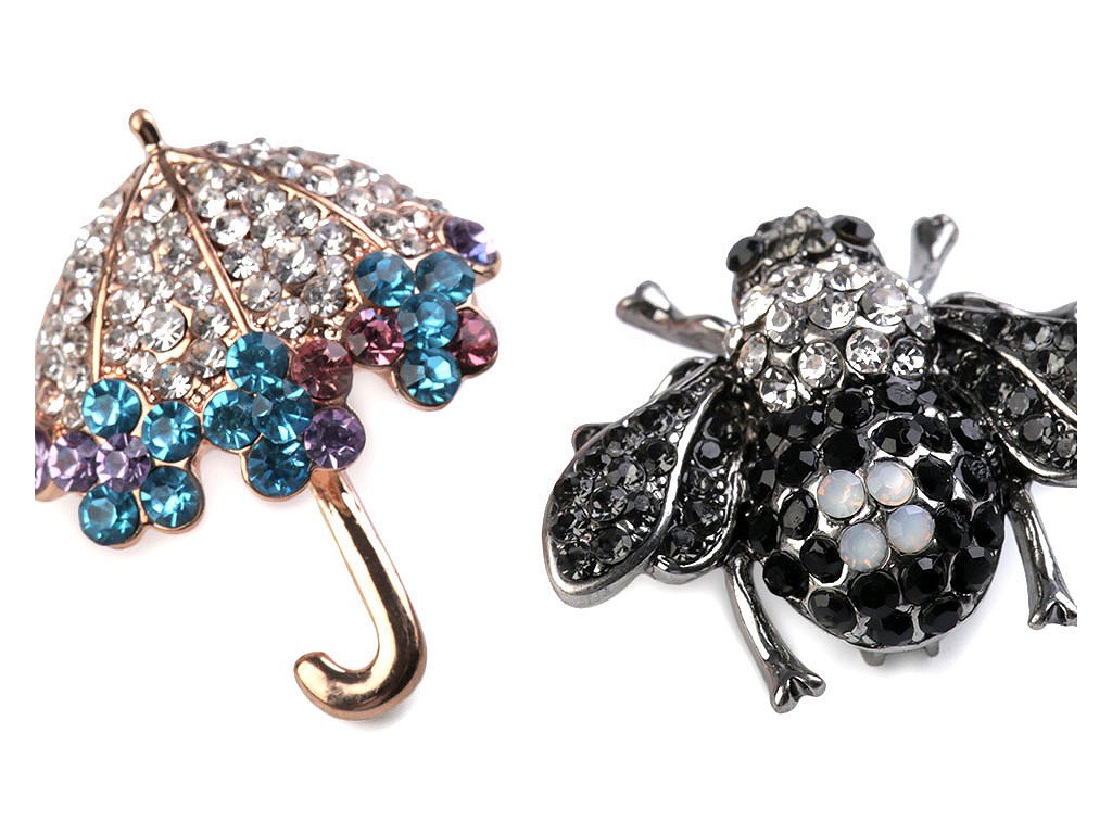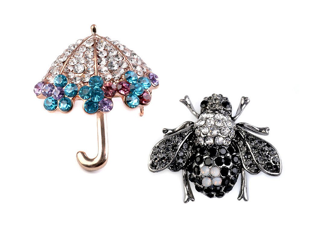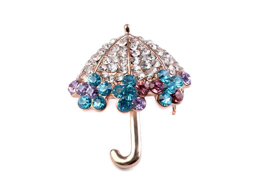 Elegantní brož s broušenými kamínky působí velice přepychově. Kvalitní kovový základ je osázený drobnými broušenými kamínky, které se krásně třpytí. Zapíná se pomocí spínacího špendlíku, který má pojistku proti nechtěnému otevření. Brož můžete nosit nejen na oděvech, ale hodí se i k ozdobení klobouků, tašky či sepnutí šátku. Brož je na kartě, která se dá zavěsit na prodejní stojany. Brož č.1 - deštník - může mít různé barevné kombinace kamínků.- Rozměry: č. 1: 2,5 x 3 cm