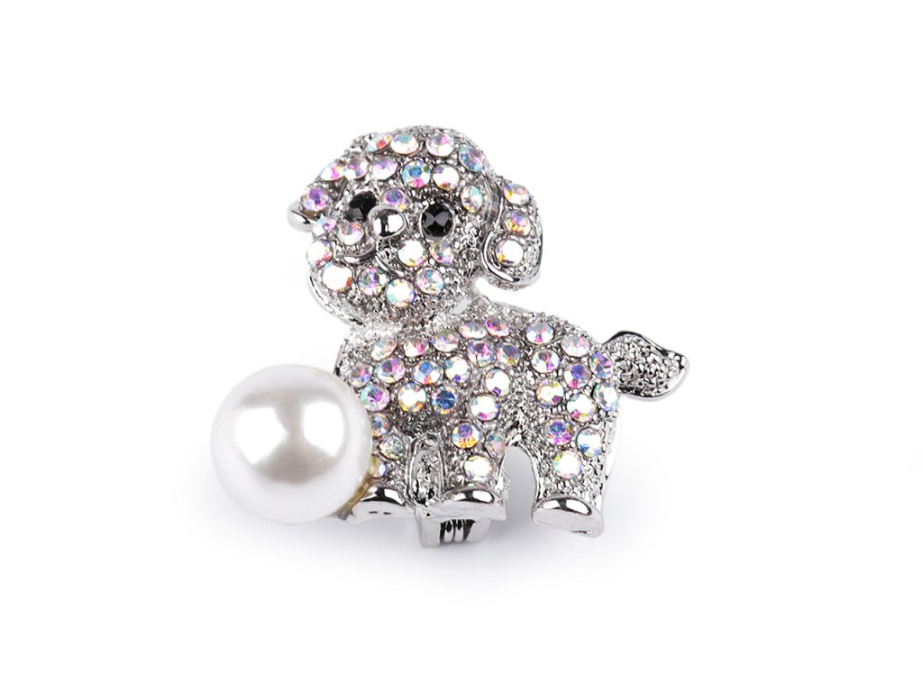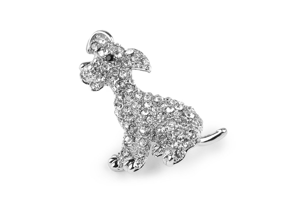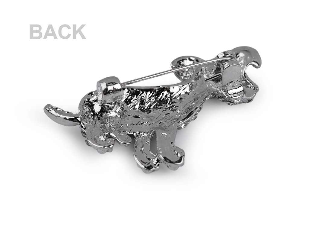 Kovová brož pejska je po celém povrchu osázená třpytivými broušenými kamínky. Díky nim působí brož roztomile, ale zároveň elegantně. Můžete s ní ozdobit oděvy i doplňky jako jsou šátky, klobouky, tašky apod. Zapíná se pomocí brožového špendlíku. Brož č.2 je ozdobená perlou. Brož je na plastové kartě, která se dá zavěsit na prodejní stojany.- Rozměry: č. 1: 3 x 3,5 cm