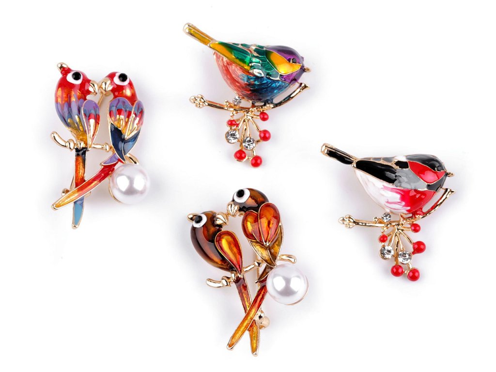 Brož ptáčků s barevným smaltem vás uchvátí svou pestrou hrou barev. Je velice milá a elegantní, můžete ji využít na běžné nošení i na společenské události - návštěvy divadel, oslavy apod. Z rubu má brožový špendlík. Můžete ji nosit nejen na oděvech, hodí se i k ozdobení klobouků, tašky či sepnutí šátku. Brože č.1 a 2 - papoušci jsou ozdobené perlou. Brože č.3 a 4 - ptáček má větvičku ozdobenou broušenými kamínky. Brož je na plastové kartě, kterou lze zavěsit na prodejní stojany.- Rozměry: č. 1 a 2: 3 x 5 cm