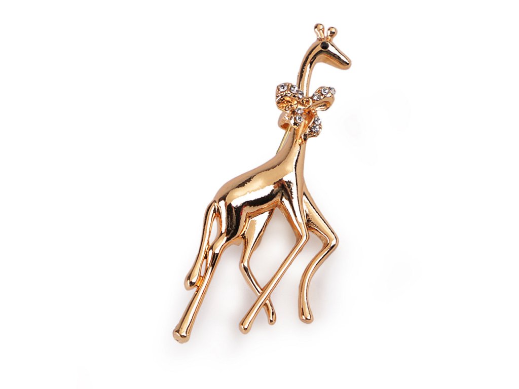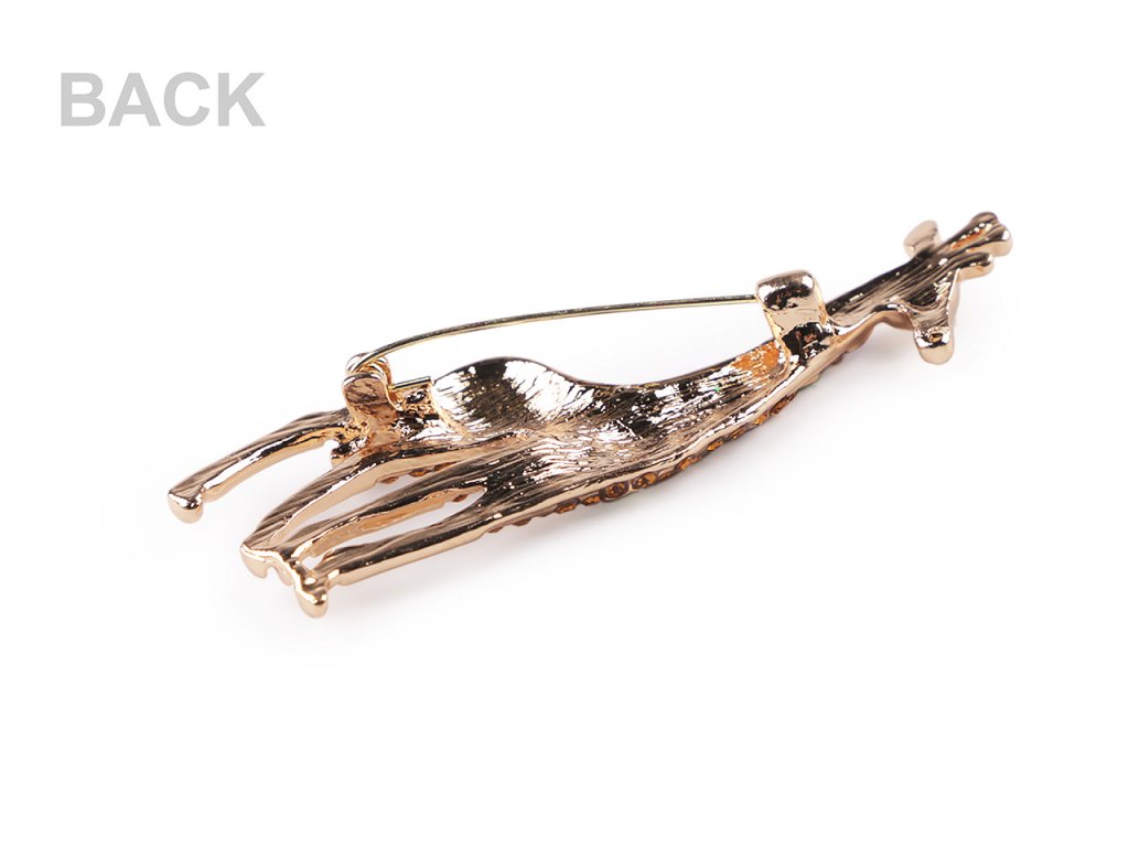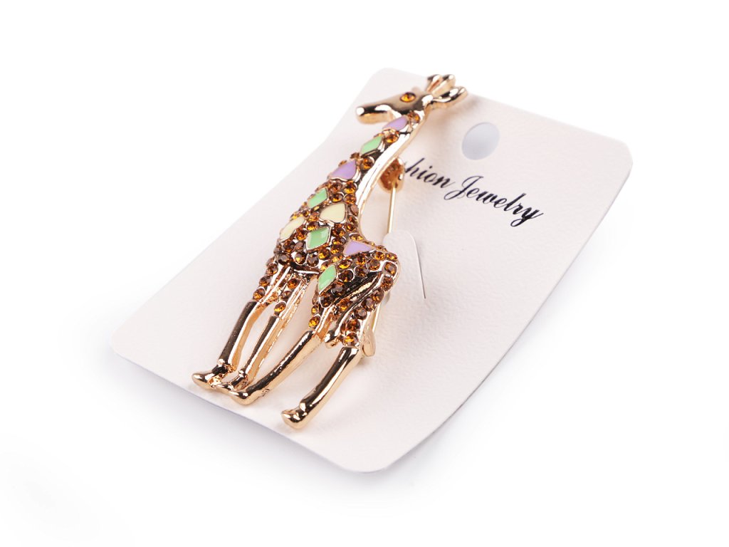 Kovová brož s designem žirafy je originálním doplňkem oděvů, tašek, batohů i šátků. Díky broušeným kamínkům se efektně třpytí. Zapíná se pomocí spínacího špendlíku. Brož je na plastové kartě, která se dá zavěsit na prodejní stojany.- Rozměry: č. 1: 2,5 x 7 cm