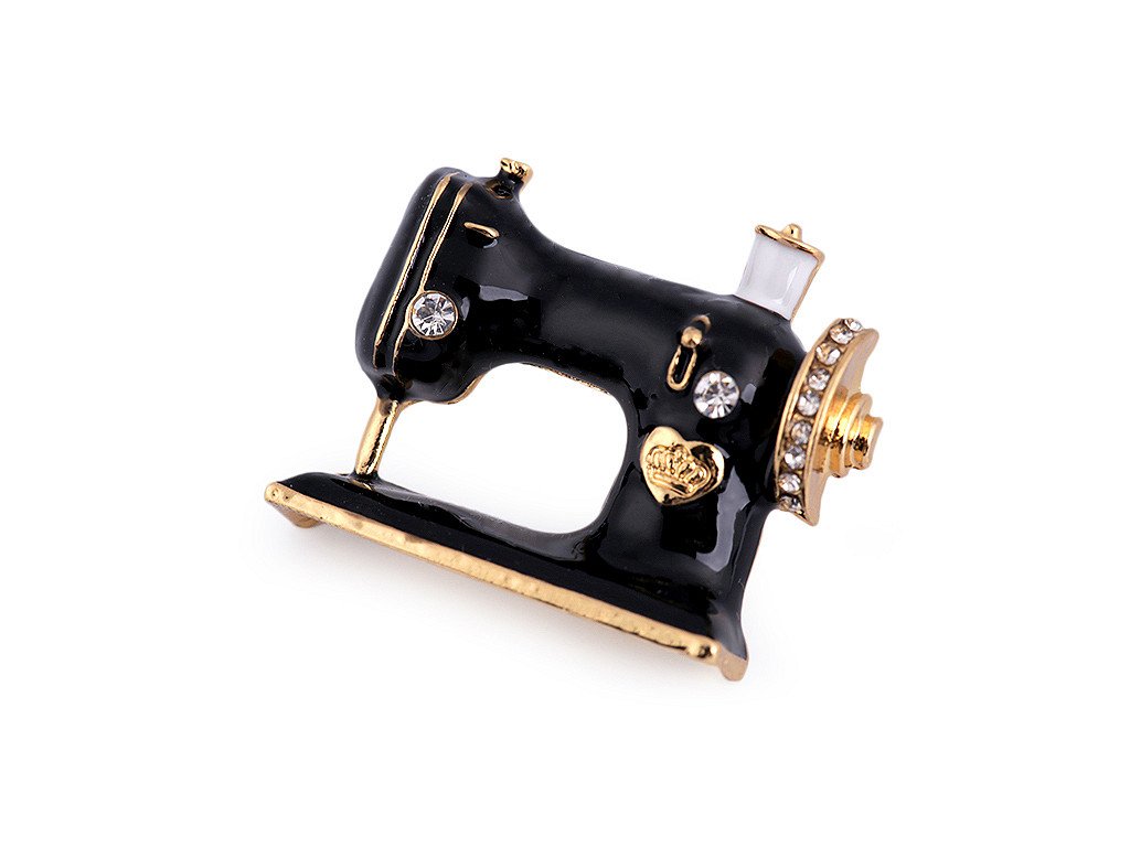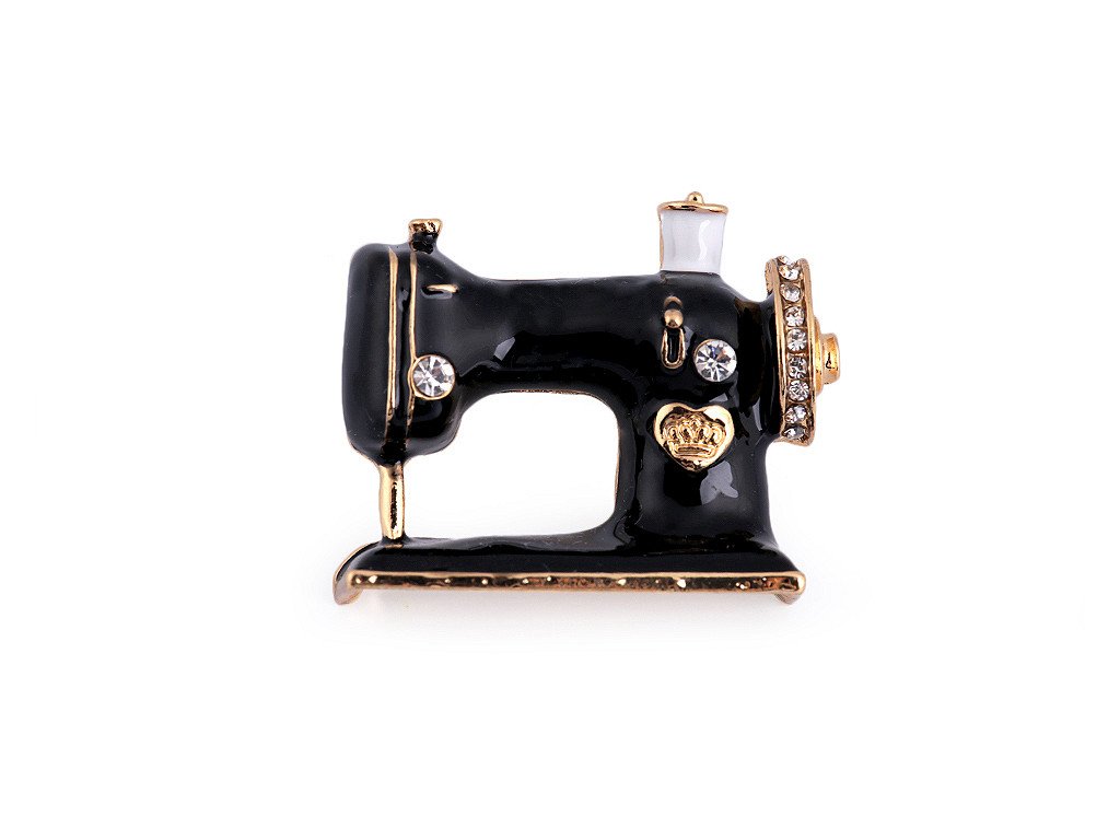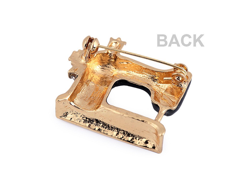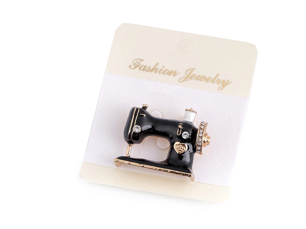 Smaltovaná brož šicí stroj bude skvělým dárkem nejen pro švadlenku. Ocení ji i ženy, které milují vintage styl. Je decentně ozdobená broušenými kamínky, díky kterým se jemně třpytí. Z rubu má zavírací špendlík s pojistkou proti otevření. Můžete ji nosit nejen na oděvech, hodí se i k ozdobení klobouků, tašky či sepnutí šátku. Brož je na plastové kartě, kterou lze zavěsit na prodejní stojany.- Šířka: 2,8 cm