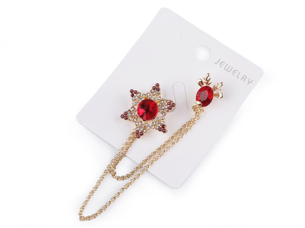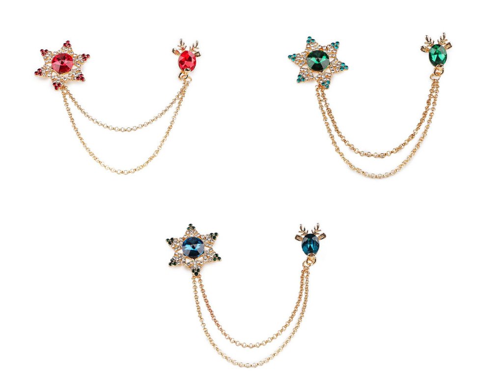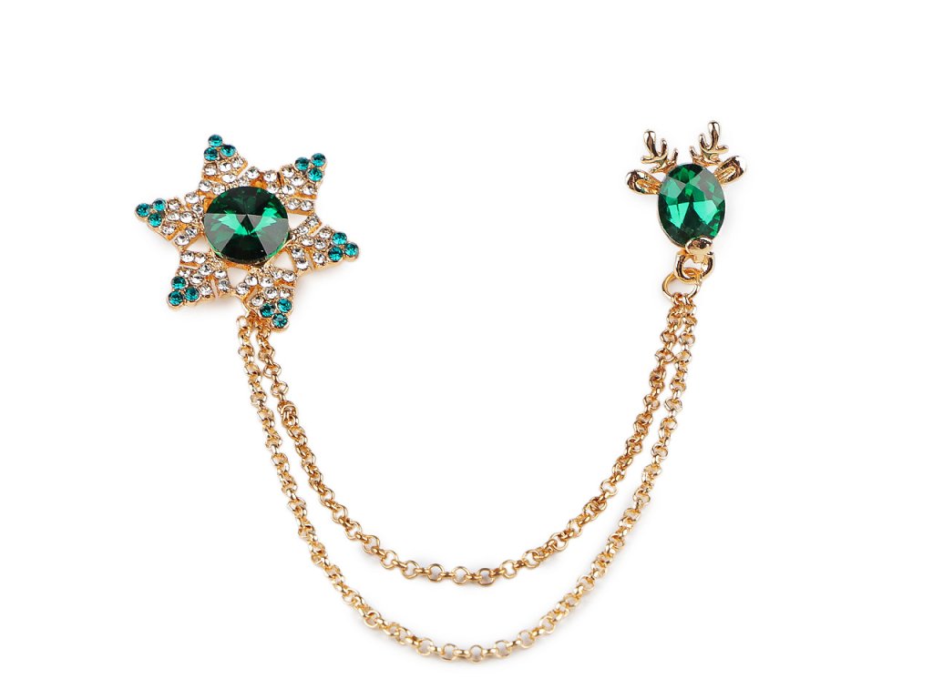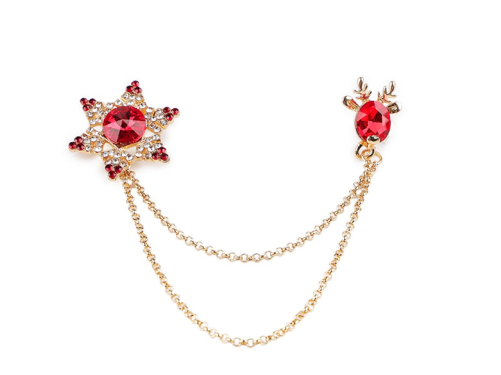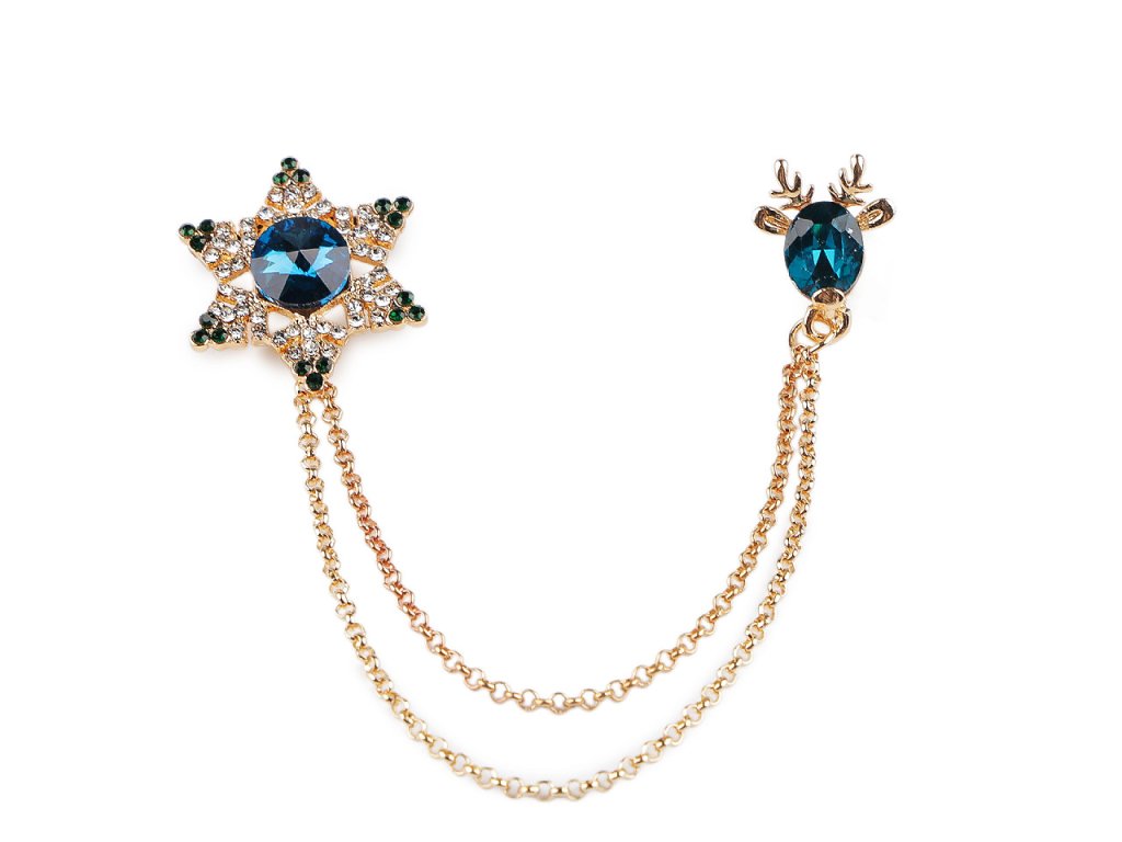 Brož / spona dragoun s vánočním designem je elegantním doplňkem, který zaujme na první pohled svým jemným a propracovaným designem. Je ozdobená broušenými kameny, na jedné straně najdete sněhovou vločku, která je propojená očkovými řetízky s jelení hlavou na druhé straně. Dragoun zajímavě oživí každý outfit. Můžete si jej připnout na sako, kabát, košili, halenku i tašku. Vločka má brožový špendlík, jelen má jednobodové zapínání jako odznak. Dragoun je umístěný na plastové kartě, která se dá zavěsit na prodejní stojany.- Rozměry: cca 7 x 8 cm