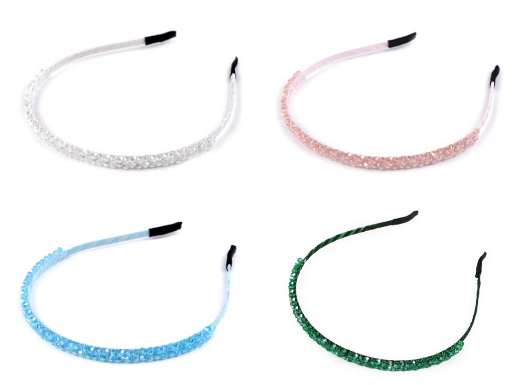 Čelenka s broušenými korálky je velmi slušivá a elegantní. Hodí se jako doplněk do vlasů pro nevěsty a družičky, ale také na slavnostní příležitost jako jsou křtiny, narozeniny, různé party, plesy, koncerty a večírky. Kovový základ široký 0,5 cm je ovinutý monofilovou stuhou. Na něm jsou připevněné skleněné korálky s poutavým třpytem.- Obvod: 37 cm