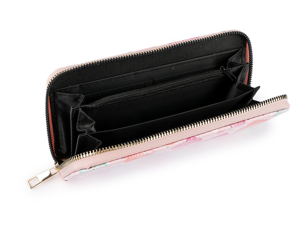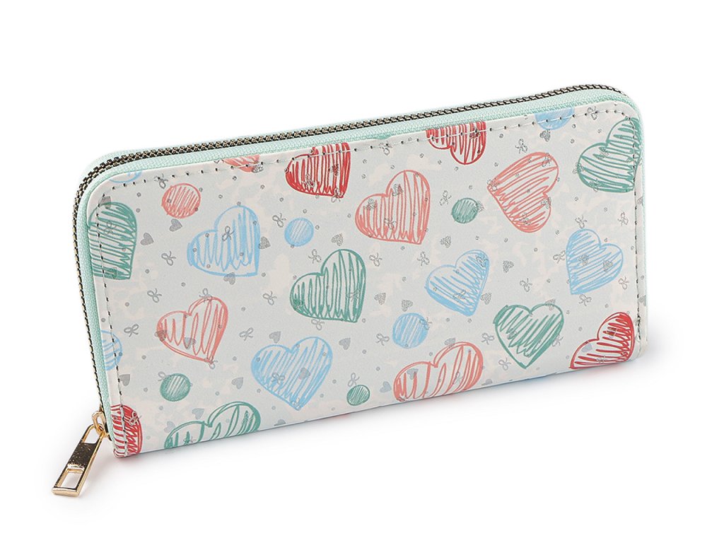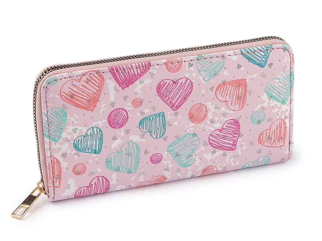 Peněženka s potiskem srdíček je elegantním a stylovým doplňkem. Upoutá pozornost i díky svému třpytu, který způsobují malá metalická srdíčka a mašličky v potisku. Peněženka obsahuje jednu hlavní kapsu, která se zapíná na kovový zip. Uvnitř je peněženka členěná do tří velkých přihrádek na papírové bankovky a jedné uzavíratelné kapsy na zip, vhodné k ukládání mincí a různých drobností. Po vnitřních stranách peněženky jsou přihrádky na karty a dvě větší na doklady, účtenky apod.- Rozměry: 10 x 19 x 2,5 cm