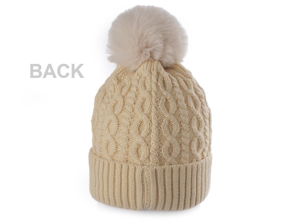 Pletená čepice s velkou bambulí a ohrnutým okrajem má zajímavý copánkový vzor. V přední části je ozdobená perlami. Bude vás hřát celou zimu, uvnitř má jemný plyš, jenž je velice příjemný na dotek. Bambule věrně imituje pravou kožešinu, perly jsou pevně přinýtované. Volně položený obvod lemu je 38 cm, natažený až 60 cm. Výška lemu je 6,5 cm. Výška čepice je 23 cm bez bambule.- Výška: 23 cm