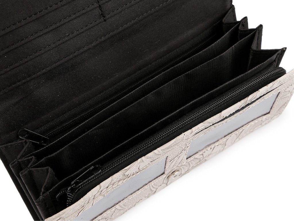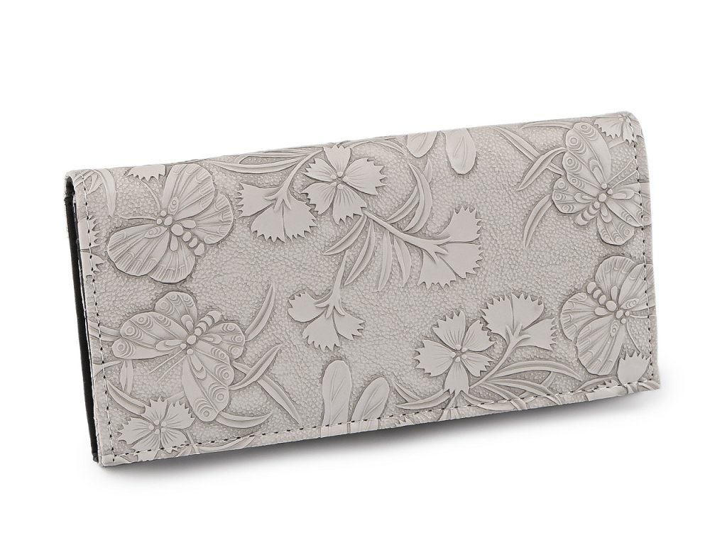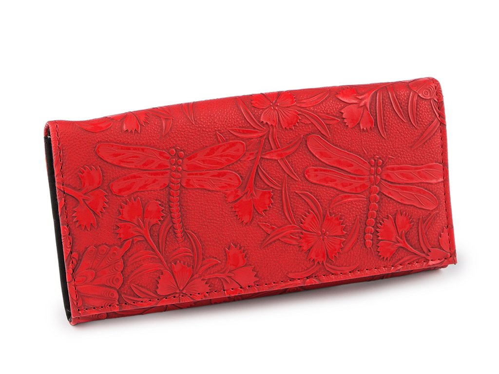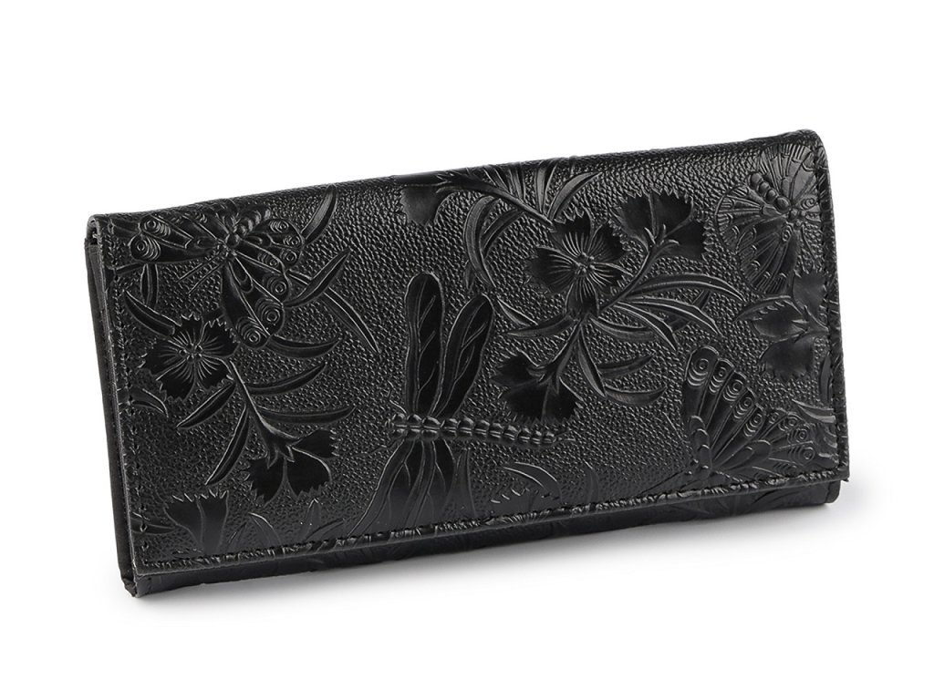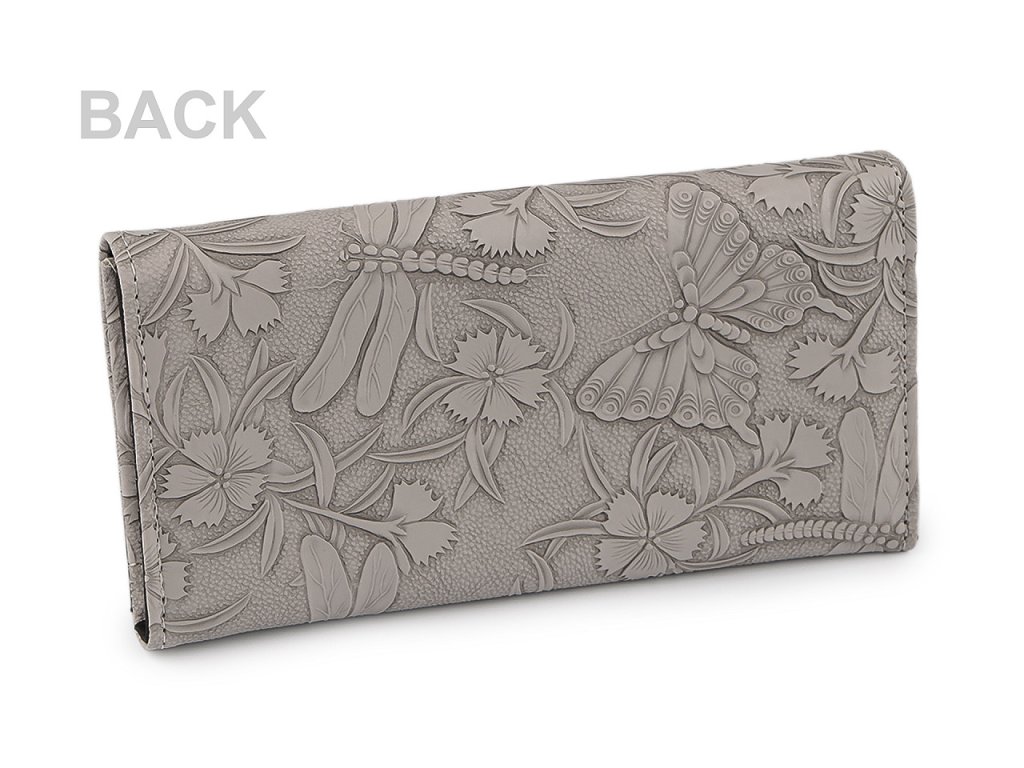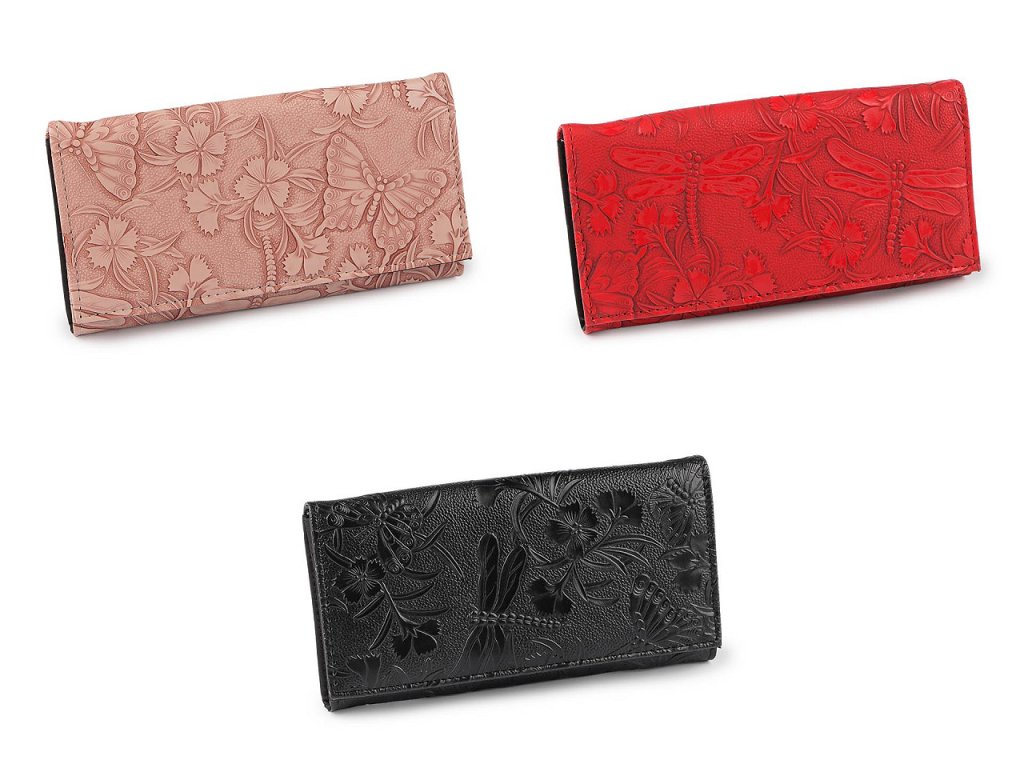 Dámská peněženka s 3D reliéfem vážek a motýlů má velice kvalitní provedení. Matný povrch jí dodává moderní vzhled a chrání před nechtěnými otisky prstů. Její vkusné zdobení vytváří jedinečný vzhled, který zaujme při každé příležitosti. Zavírá se na klopu a patent. Disponuje přihrádkami na karty, 2 z nich mají průhledná okénka. Uprostřed peněženky se nachází přihrádky na bankovky, a velký mincovník s přepážkou, který se zapíná na zip.- Rozměry: 9,5 x 19 x 3 cm