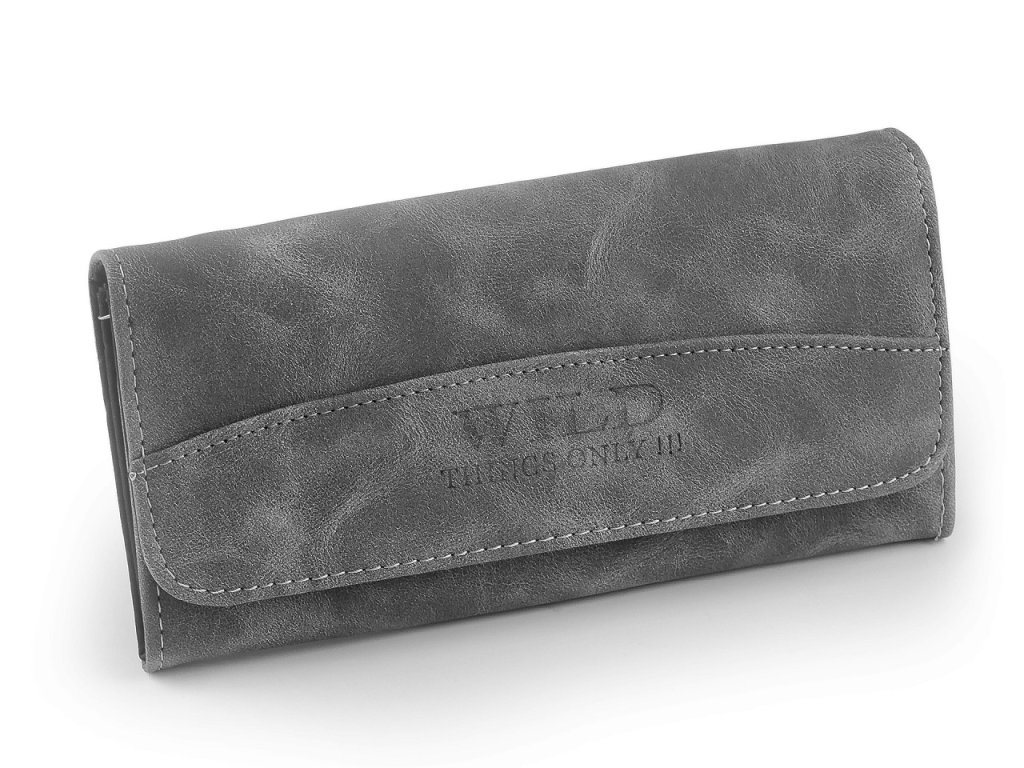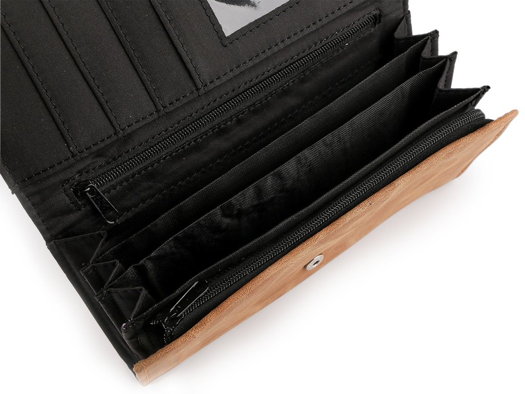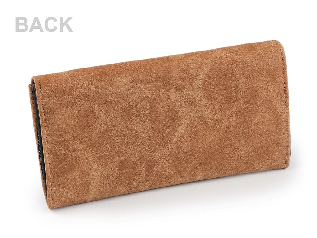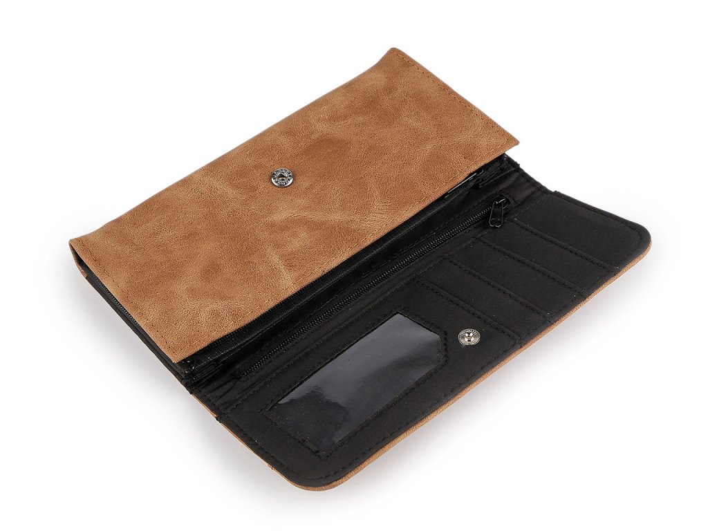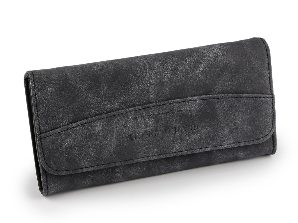 Dámská peněženka z broušené eko kůže má elegantní nadčasový design. Stane se vaší oblíbenou společnicí, snadno ji sladíte s jakýmkoliv stylem oblečení. Zavírá se na klopu a patent. Peněženka má celkem 4 přihrádky na karty, z nichž jedna je průhledná. Za ní jsou umístěné 2 dlouhé přihrádky, jedna z nich je na zip. Uprostřed peněženky se nachází 3 kapsy na bankovky, oddělené přepážkami. Vlevo je rozkládací mincovník rozdělený přepážkou na dva oddíly. Uzavírá se na zip.- Rozměry: 10 x 19 x 2,5 cm