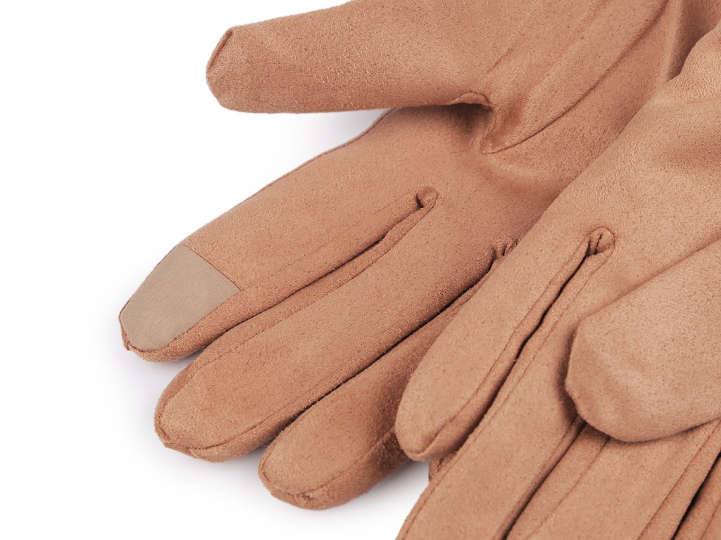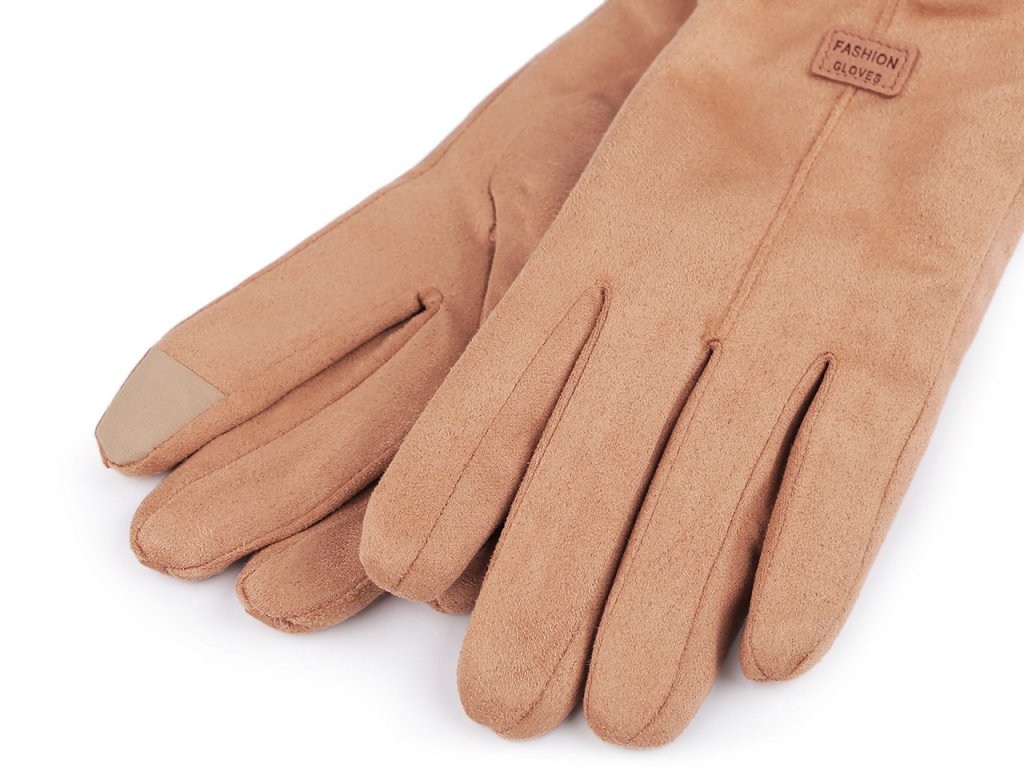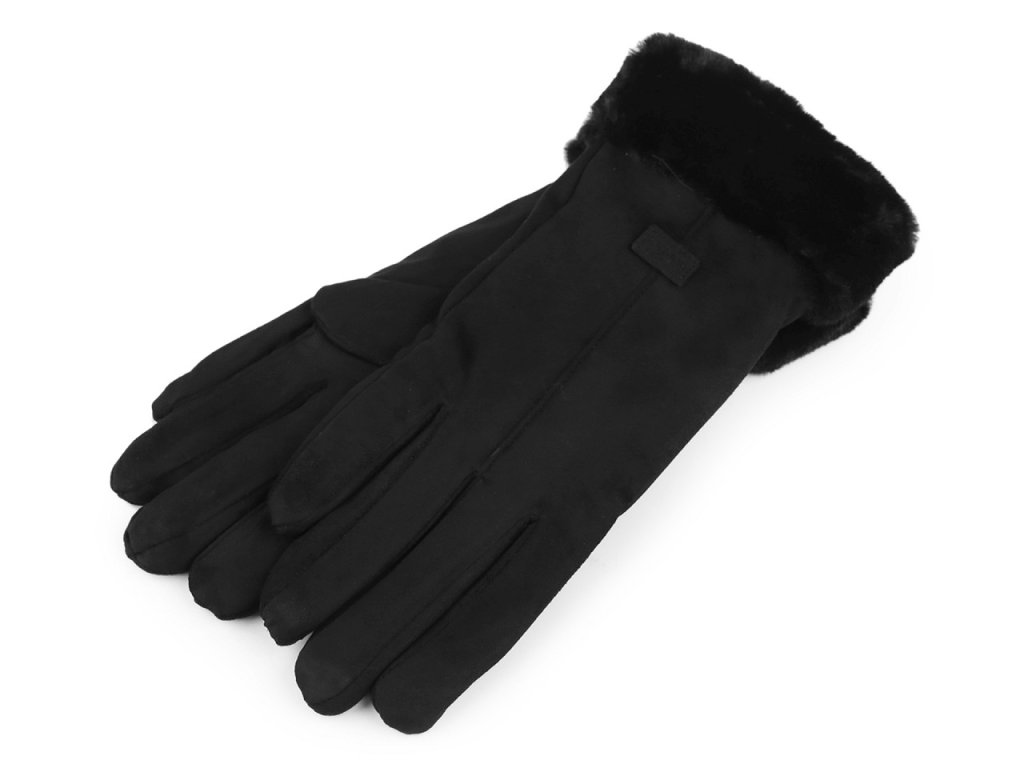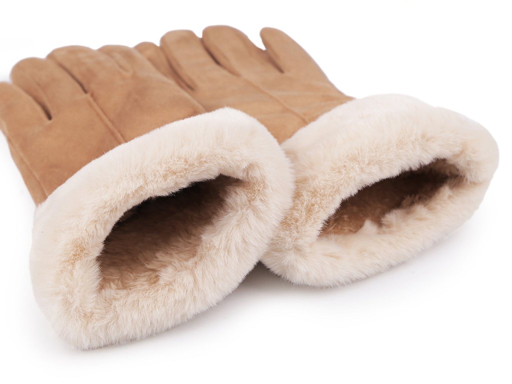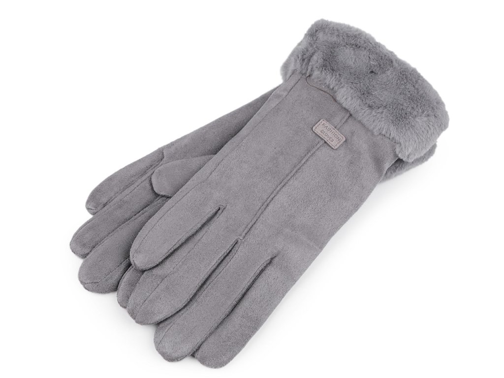 Elegantní dámské rukavice zdobí lem z umělé kožešiny a štítek s nápisem Fashion gloves. Rukavice jemně pruží, jejich povrch připomíná broušenou kůži. Uvnitř mají příjemný plyšový kožíšek. Hodí se do zimy i do chladnějšího podzimního počasí. Na ukazováčku pravé ruky je speciální tkanina, díky které můžete ovládat dotykové přístroje - mobil, tablet, bankomat apod. Šířka je měřená na volně položených rukavicích uprostřed (bez palce).- Šířka: 8,5 cm
