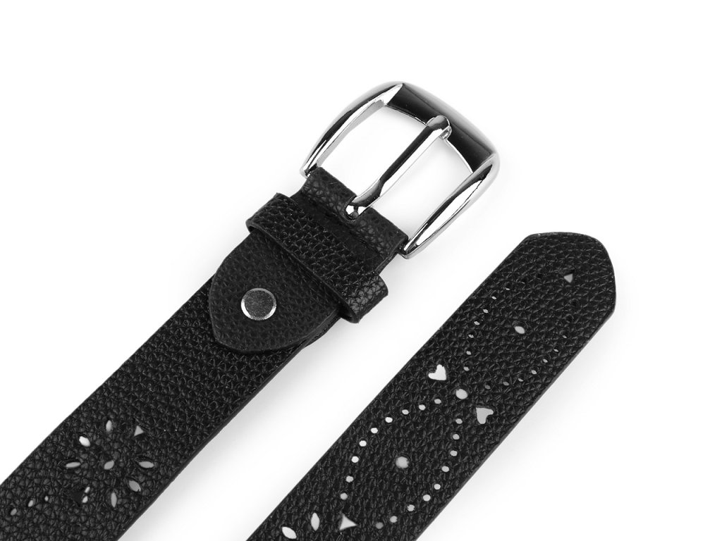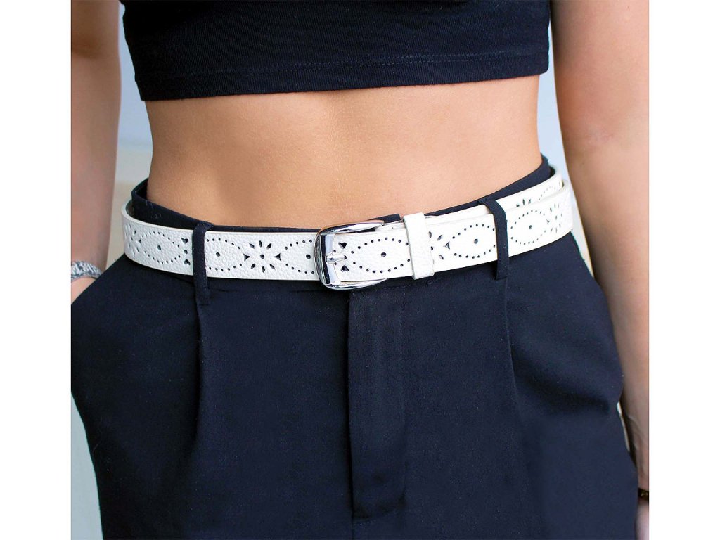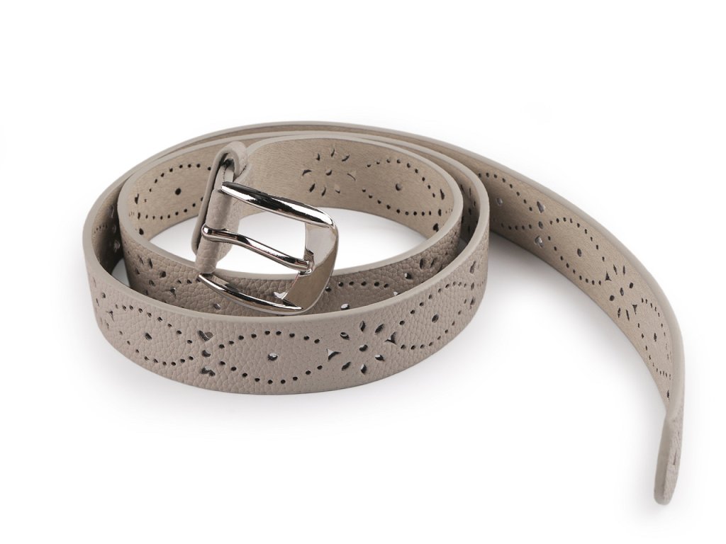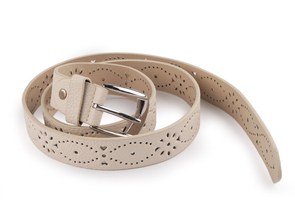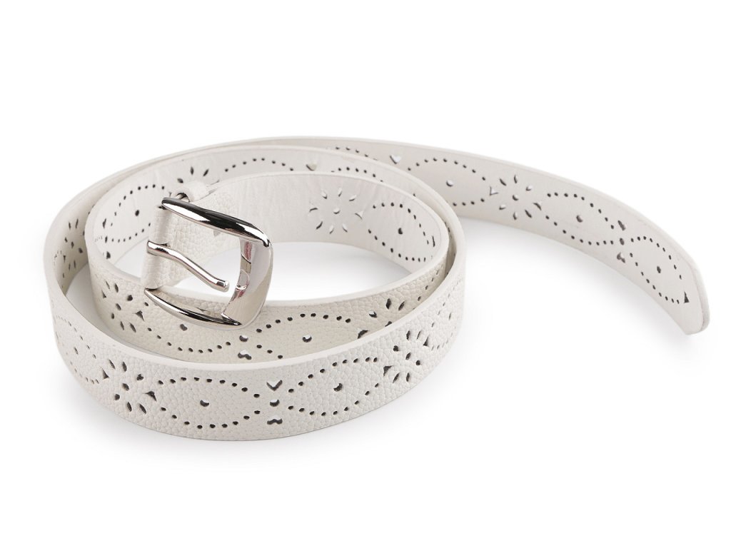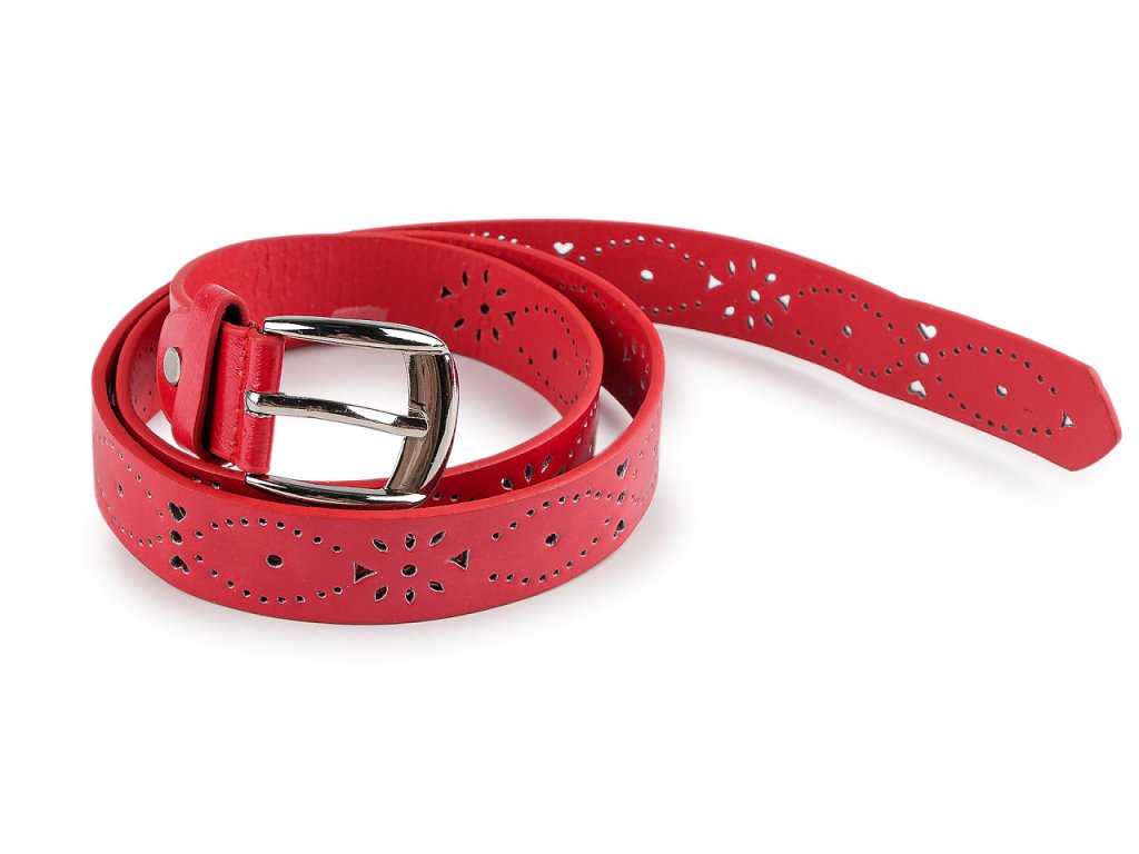 Dámský pásek s ozdobnou perforací po celé délce se řadí k nadčasovým modelům. Je vyrobený z eko kůže, dá se dobře kombinovat se širokou škálou oděvů. Zkombinujete ho s různorodými styly, od ležérního až po formální. Mohou jej nosit i dívky, protože obvod pásku si lehce přizpůsobí svému pasu. Má klasickou kovovou sponu na zapnutí. Maximální obvod zapnutí je 104 cm. Pásek se dá zkrátit na potřebnou délku díky šroubku, který je umístěný za sponou. Pásek č. 4 - červený je pololesklý.- Šířka: 2,7 cm