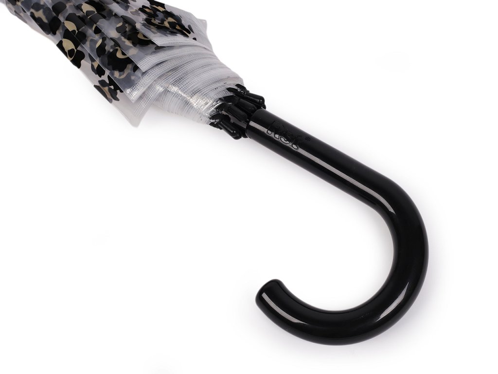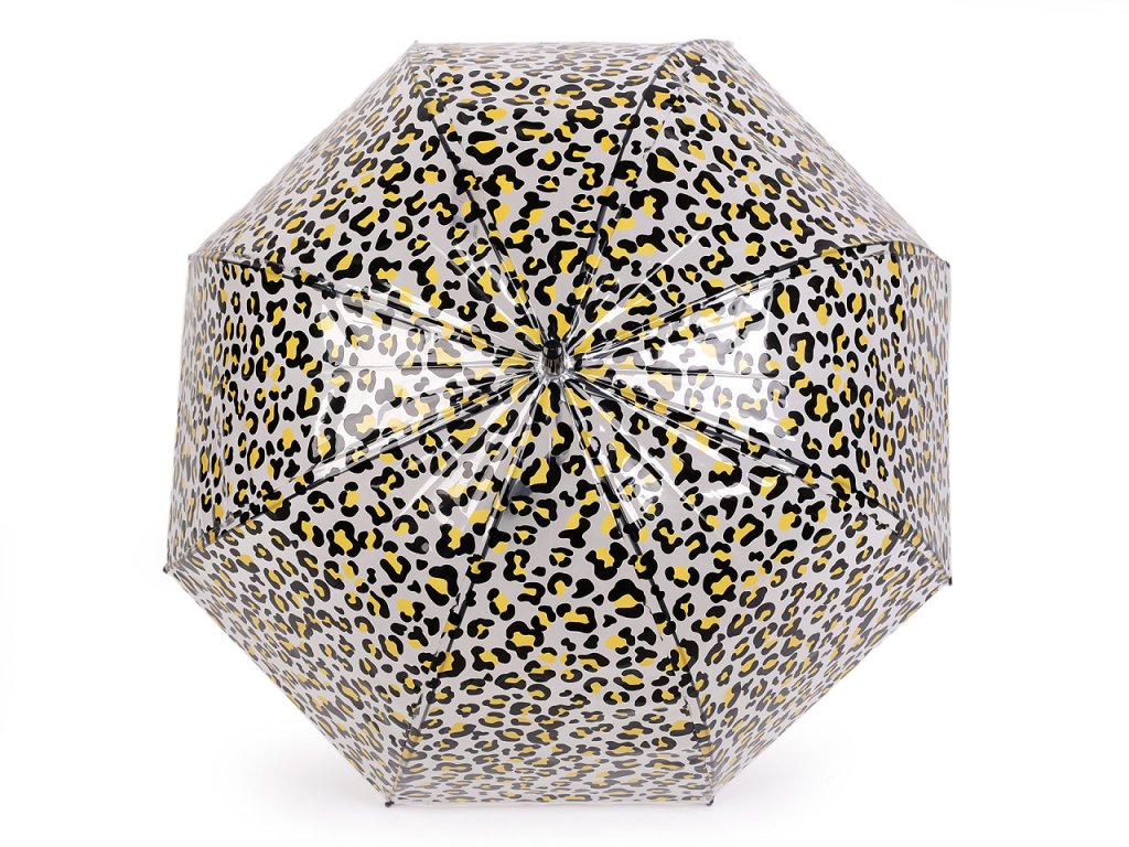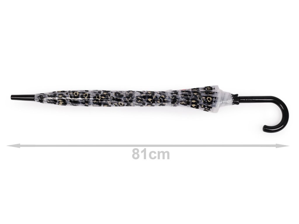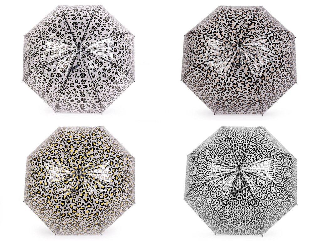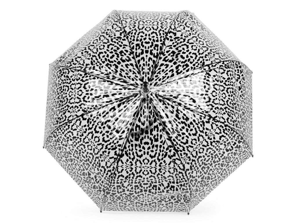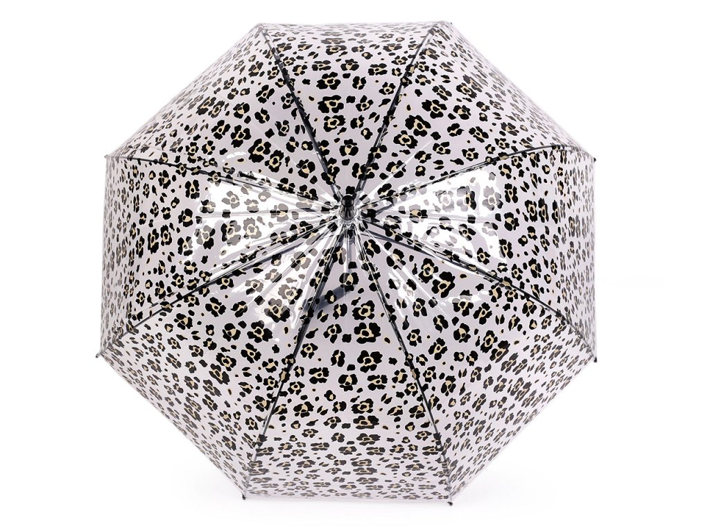 Průhledný deštník s barevným leopardím potiskem je ideální volbou pro všechny, kteří chtějí být styloví i za deštivého počasí. Je vystřelovací, určitě oceníte jeho velkou hloubku. Konstrukce deštníku je z kovového drátu a pružných lamel, tvoří osm polí. Díky nim je velice pevný, neohne se ani za největšího nečasu. Klasická tyč je zakončená pevnou rukojetí. Hloubka deštníku je 34 cm.- Rukojeť: plastová