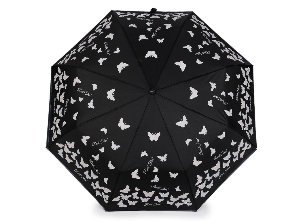 Kouzelný dámský skládací deštník mění barvy motýlů při kontaktu s vodou. Doma se vám bude deštník jevit jako nenápadný a jen co zaprší, začně hýřit barvami. Deštník má vystřelovací mechanizmus - rozevře se stisknutím tlačítka, zavírá se manuálně. Konstrukce je tvořena osmi poli. Středová tyč je vyrobená z magnetizujícího kovu. Deštník má plastovou rukojeť s poutkem, zapínání je na suchý zip. Součástí deštníku je ochranný obal. UV filtr vás ochrání před slunečním zářením. Hloubka deštníku je 20 cm. Celková délka je 69 cm. Délka složeného deštníku je 30 cm.- Rukojeť: plastová