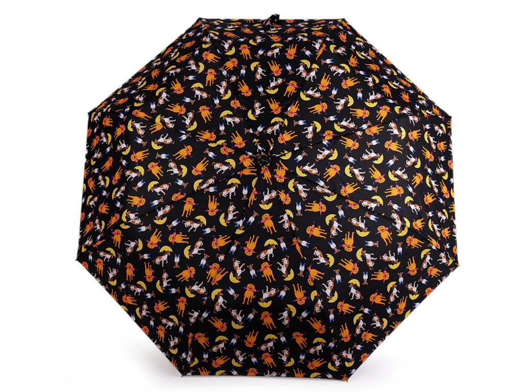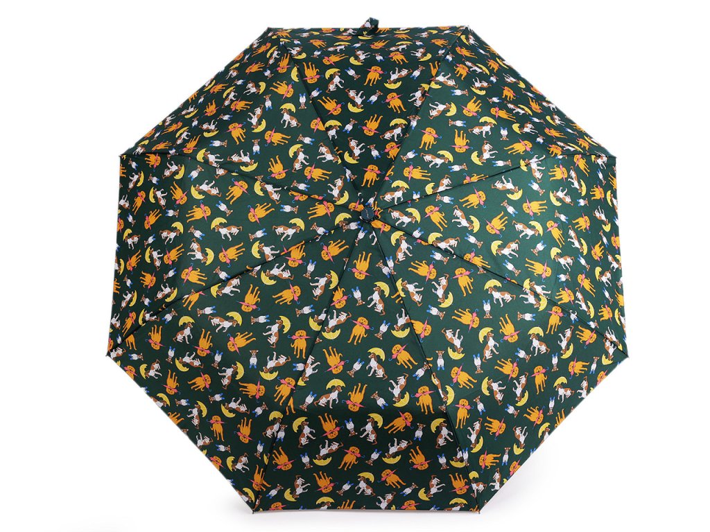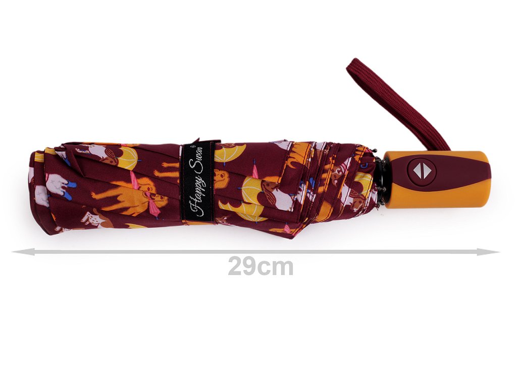 Plně automatický skládací deštník je vyrobený z kvalitního materiálu. Na potahu, který má UV filtr, je motiv pejsků s deštníky. Deštník má vystřelovací/sestřelovací mechanizmus. Rozevře i zavře se stisknutím tlačítka se šipkou nahoru nebo dolů. Rukojeť deštníku je plastová, opatřená poutkem. Konstrukce deštníku se skládá z osmi polí. Součástí deštníku je ochranný obal. Hloubka deštníku je 19 cm. Celková délka je 56 cm. Délka složeného deštníku je 29 cm.- Rukojeť: plastová