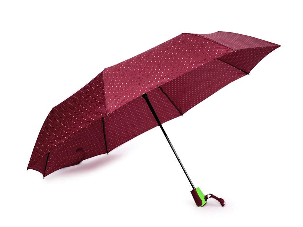 Dámský skládací deštník zdobí drobné puntíky. Deštník má vystřelovací mechanizmus - rozevře se stisknutím tlačítka, zavírá se manuálně. Konstrukce je tvořena osmi poli. Středová tyč je vyrobená z magnetizujícího kovu. Deštník má plastovou rukojeť s poutkem, zapínání je na suchý zip. Součástí deštníku je ochranný obal. Hloubka deštníku je 23 cm. Celková délka je 57 cm. Délka složeného deštníku je 31 cm.- Průměr: 91 cm