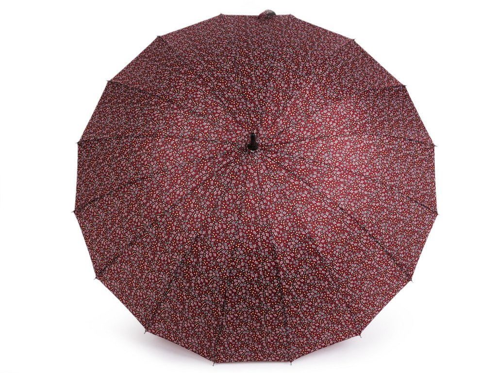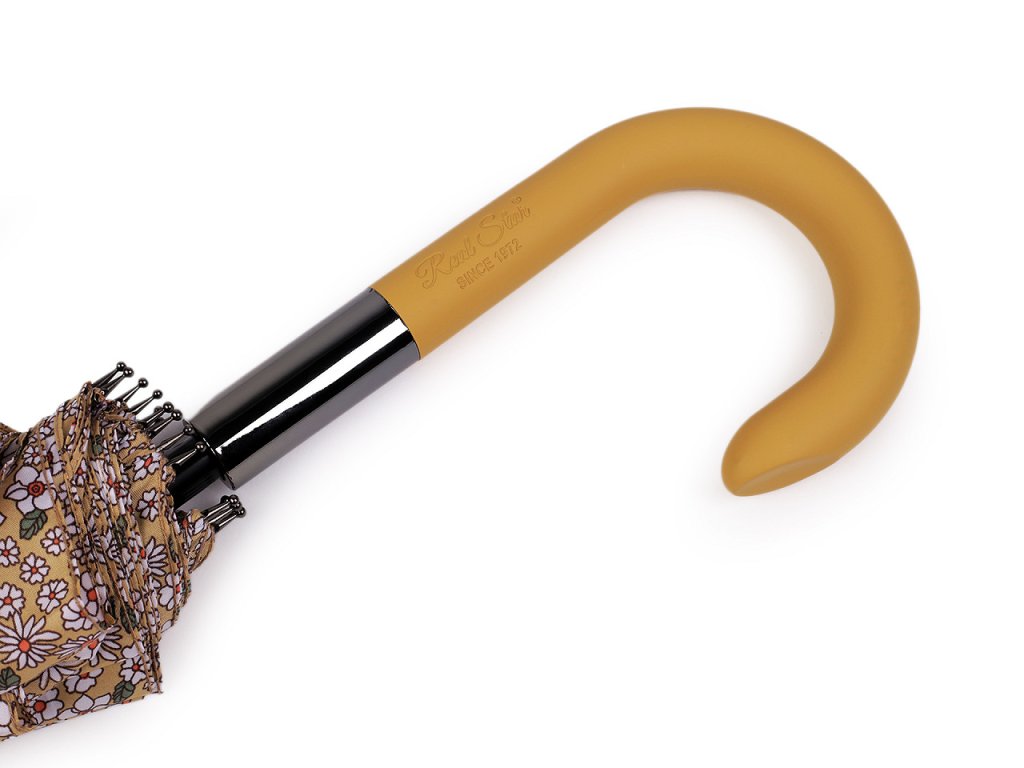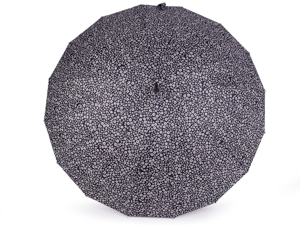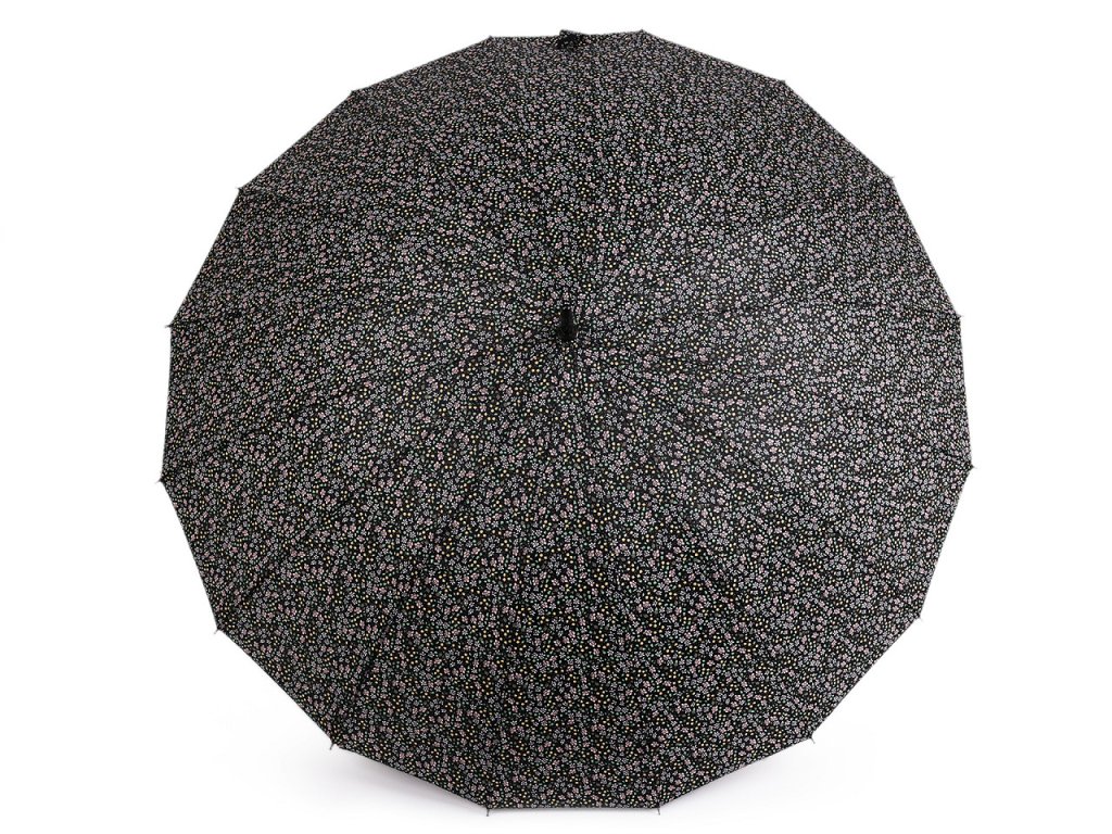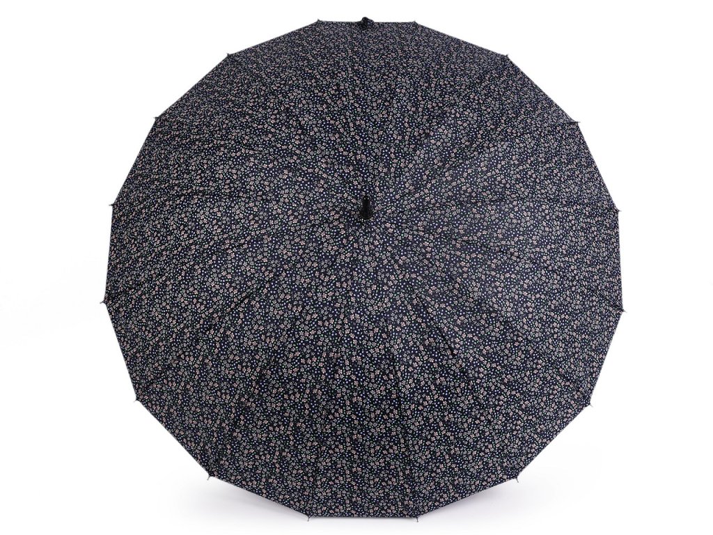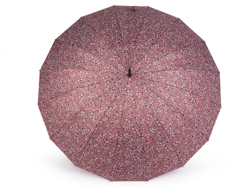 Velký dámský vystřelovací deštník se vzorovaným potahem drobných květů vás spolehlivě ochrání před nepřízní počasí. Skládá se z 16 výsečí, díky kterým se deštník řadí mezi luxusní kousky. Konstrukce je vyrobená z pružných lamel zajišťujících vysokou pevnost a stabilitu. UV filtr vás ochrání před slunečním zářením. Deštník má klasickou tyč zakončenou pevnou rukojetí. Hloubka deštníku je 26 cm.- Rukojeť: plastová