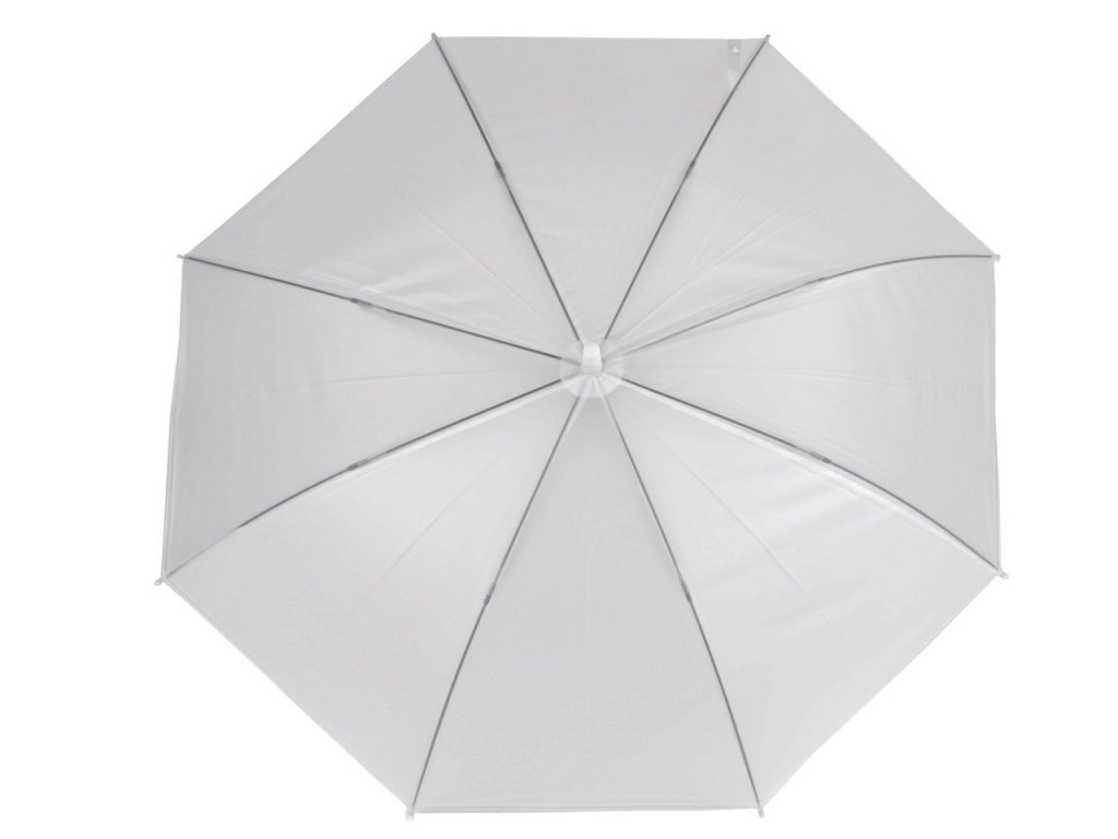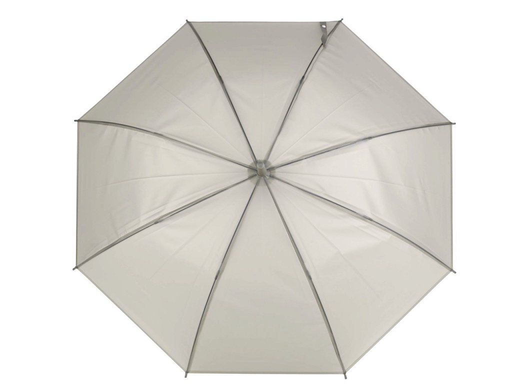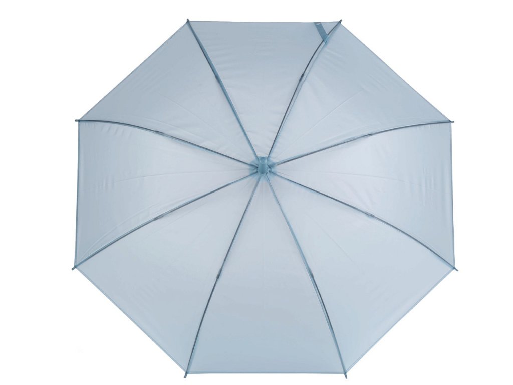 Průsvitný deštník je vystřelovací, konstrukci má z kovového drátu a pružných lamel, tvoří osm polí. Díky nim je velice pevný, neohne se ani za největšího nečasu. Klasická tyč je zakončená pevnou rukojetí. Hloubka deštníku je 24 cm.- Rukojeť: plastová