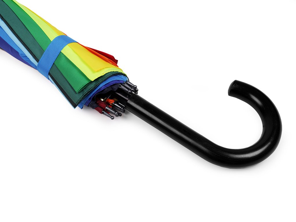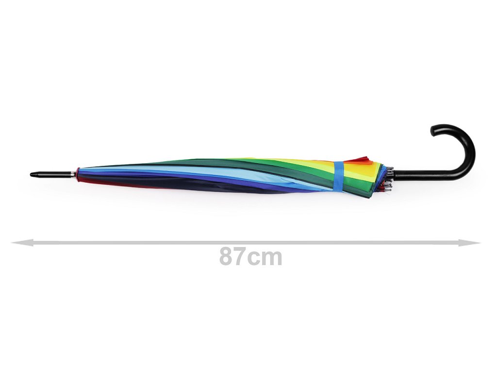 Duhový vystřelovací deštník vás spolehlivě ochrání před nepřízní počasí. Skládá se z 16 výsečí, díky kterým se deštník řadí mezi špičkové kousky. Konstrukce je vyrobena z pružných lamel zajišťujících vysokou pevnost a stabilitu. Deštník má klasickou tyč zakončenou pevnou rukojetí. Hloubka deštníku je 25 cm.- Rukojeť: plastová