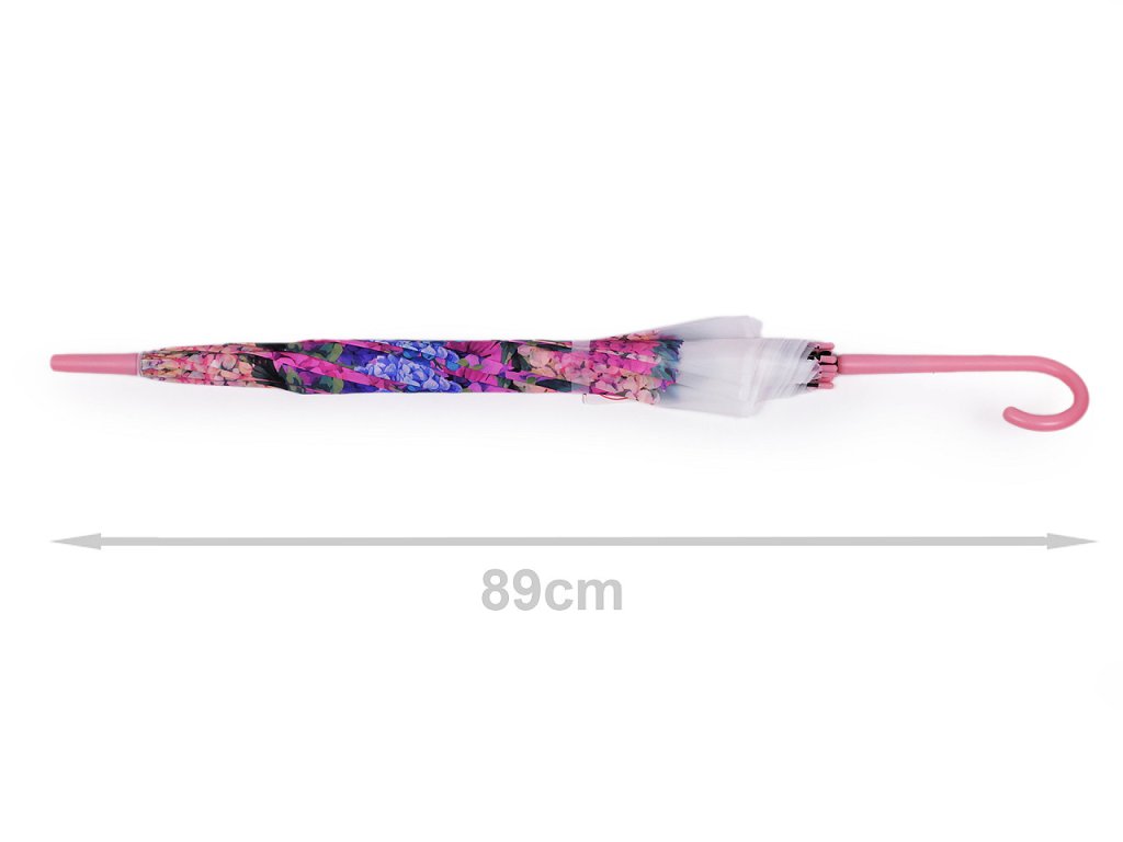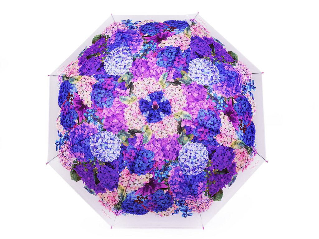 Průsvitný deštník s potiskem hortenzií je vystřelovací, konstrukci má z kovového drátu a pružných lamel, které tvoří osm polí. Díky nim je velice pevný, neohne se ani za největšího nečasu. Klasická tyč je zakončená pevnou rukojetí. Hloubka deštníku je 26 cm.- Rukojeť: plastová