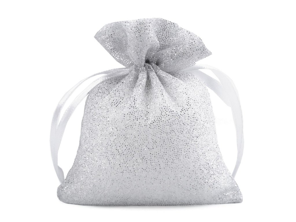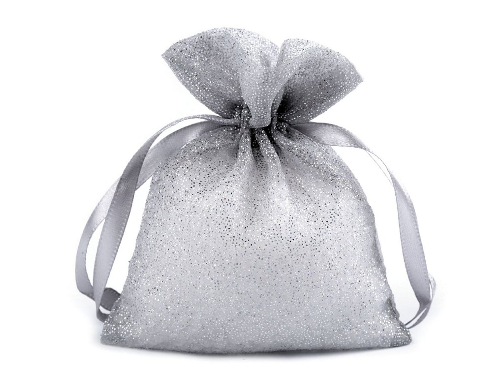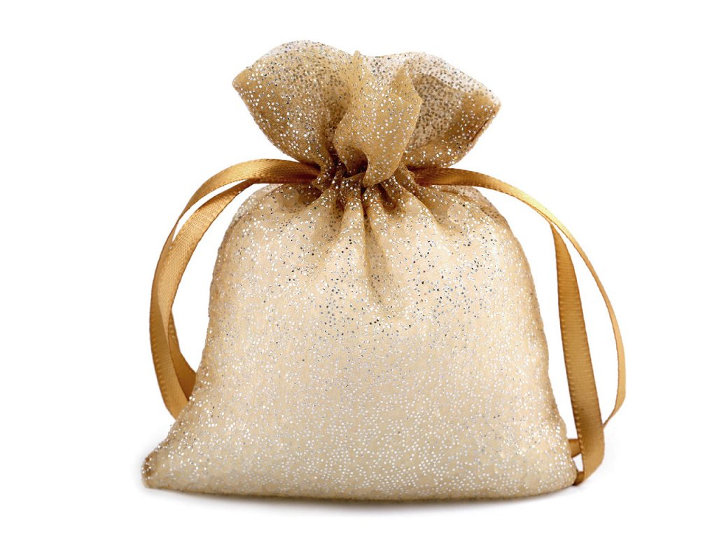 Dárkový organzový pytlíček je celý posetý glitry, díky kterým se poutavě třpytí. Působí luxusním dojmem. Hodí se k zabalení menšího dárku, který povýší na vyšší úroveň. Pytlík se snadno uzavírá pomocí dvou stahovacích saténových šňůrek. Glitry jsou pevné, z pytlíku se neodírají.- Šíře: 10 cm