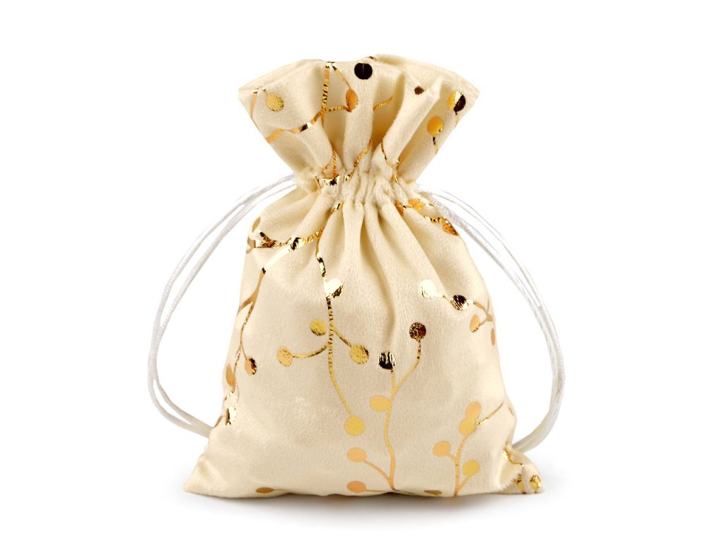 Sametový pytlíček s metalickým potiskem větviček je vhodný na zabalení menších dárků, například bižuterie, minerálních kamínků apod. Dámy mohou nosit sametové pytlíčky v kabelce a schovávat v nich vše, co má být skryto. Pytlík se snadno uzavírá pomocí dvou stahovacích saténových šňůrek.- Šíře: 13 cm