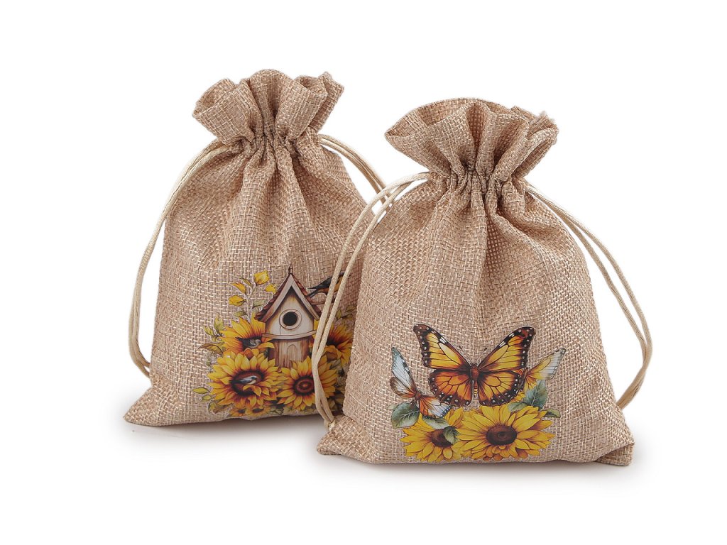 Dárkový pytlík s potiskem slunečnic je skvělý na rychlé zabalení malých dárků. Materiál pytlíku svým zpracováním připomíná jutu. Uzavírá se pomocí stahovacích saténových šňůrek. Potisk je na přední straně pytlíku, je pogumovaný. Použití: do pytlíku můžete zabalit dárky, uschovat vaše osobní poklady nebo naaranžovat voňavé sušené květy.- Šíře: 13 cm