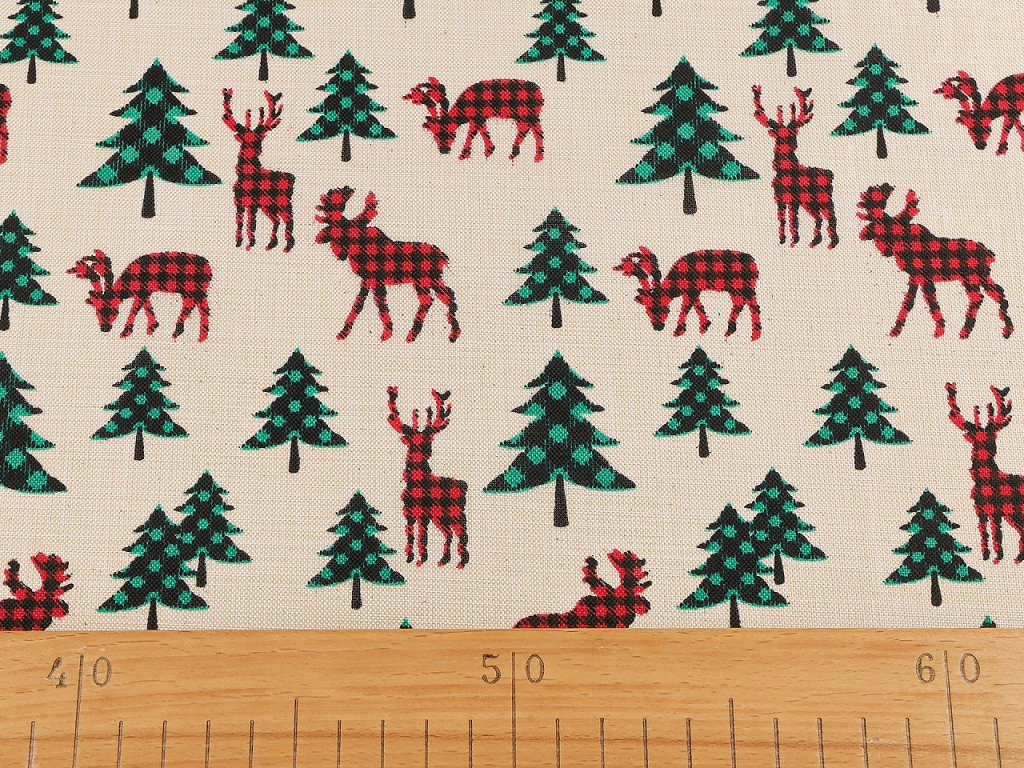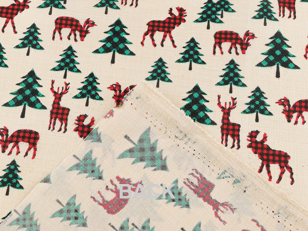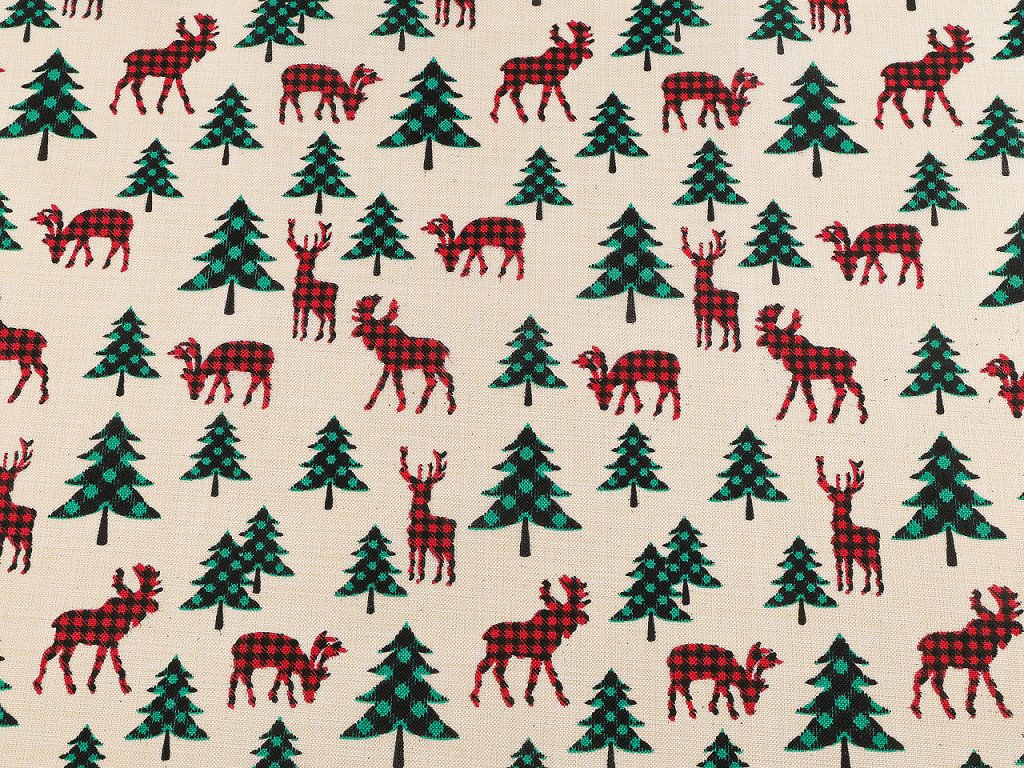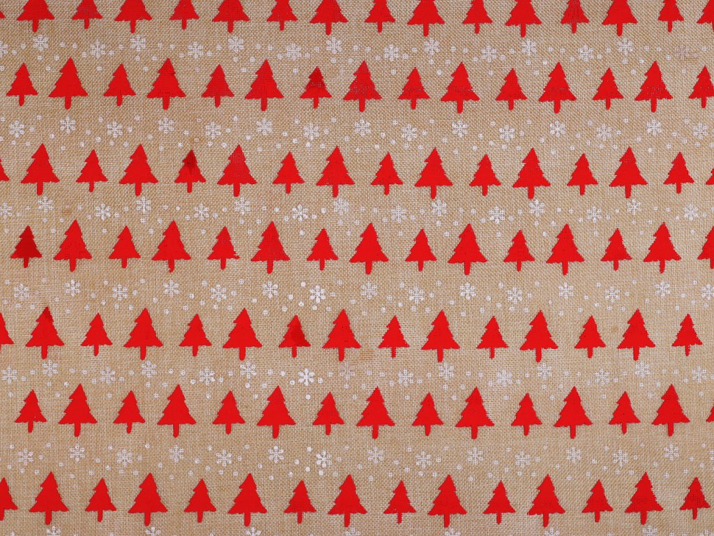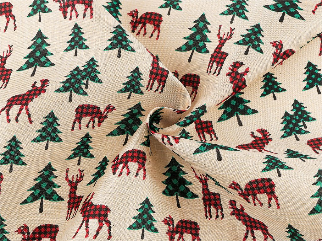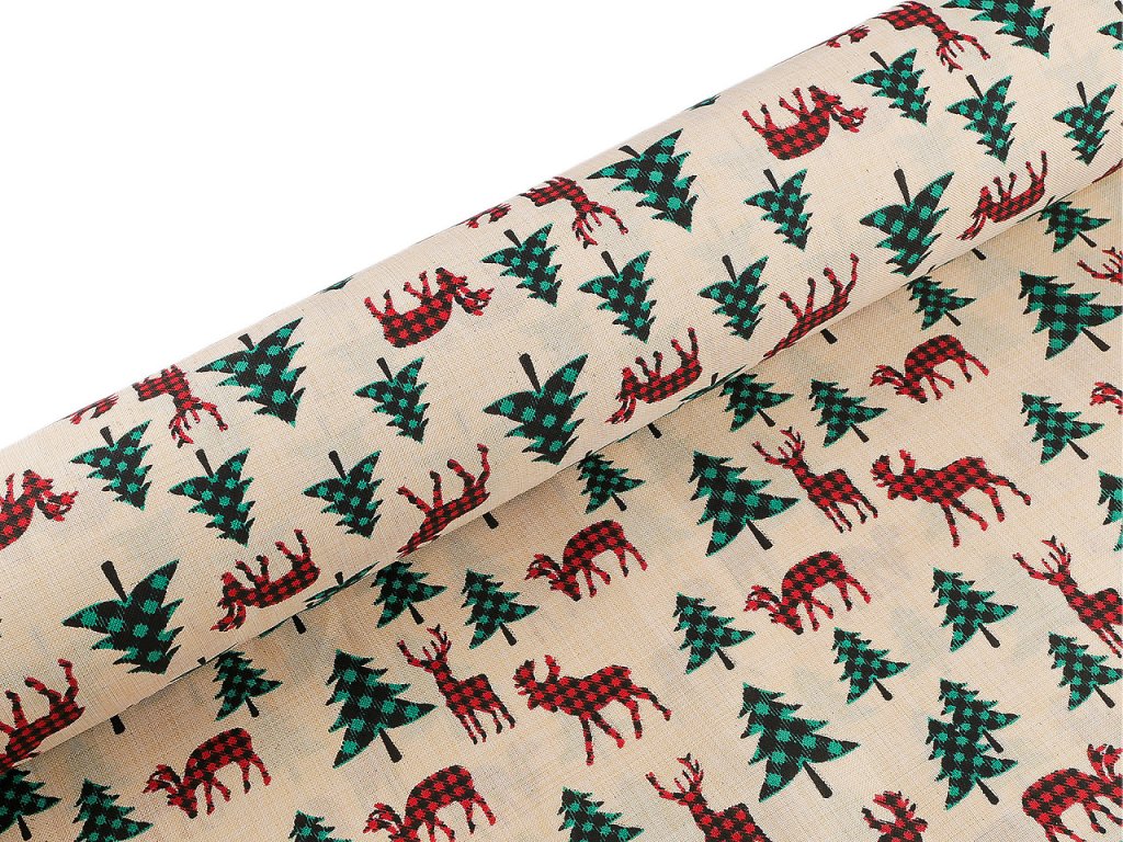 Imitaci juty zdobí potisk stromečků a sobů. Je pevná a tužší na dotek. Využijete ji na šití pytlíčků, ubrusů, prostírání nebo běhounů.
