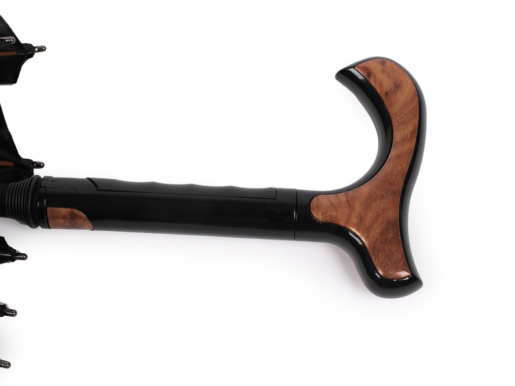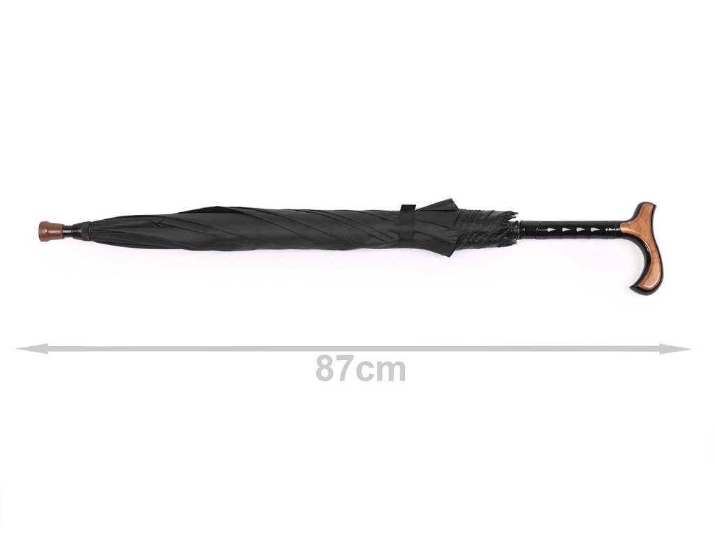 Vystřelovací deštník s vycházkovou holí je vyrobený z kvalitního materiálu. Ve středové tyči má vloženou vycházkovou hůl, která se dá v případě potřeby pootočením vytáhnout. Když neprší, slouží jako hůl celý deštník, v dešti se hůl vytáhne. Tvarovaná rukojeť s imitací dřeva padne přímo do ruky. Nahoře na deštníku je široká patka na pohodlnou chůzi. Deštník je kvalitní, velice pevný, odolá náporům větru. Konstrukci tvoří osm polí. Hloubka deštníku je 24 cm.- Rukojeť: plastová