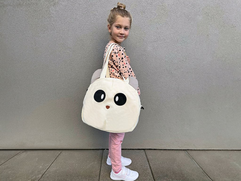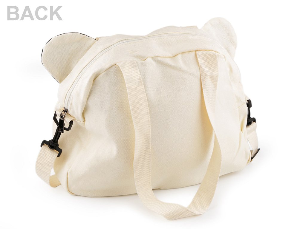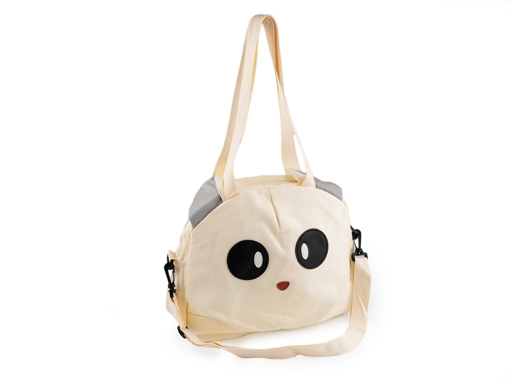 Sportovní tašku v podobě zvířátka si děti zamilují na první pohled. Je pevná, vyrobená z kvalitního bavlněného plátna. Přední stranu má ozdobenou koženkovými detaily. Zvířátko určitě zaujme i přečnívajícími oušky. Taška má jednu hlavní kapsu, která se uzavírá na zip, uvnitř má podšívku s malou kapsičkou na zip na drobnosti. Má dvě pevná ucha na bošení v ruce a na rameni a nastavitelný popruh na karabiny na nošení křížem.- Rozměry (ŠxVxH): 35 x 30 x 8 cm