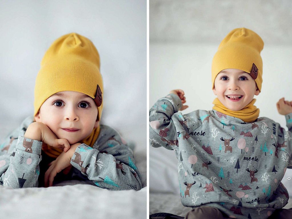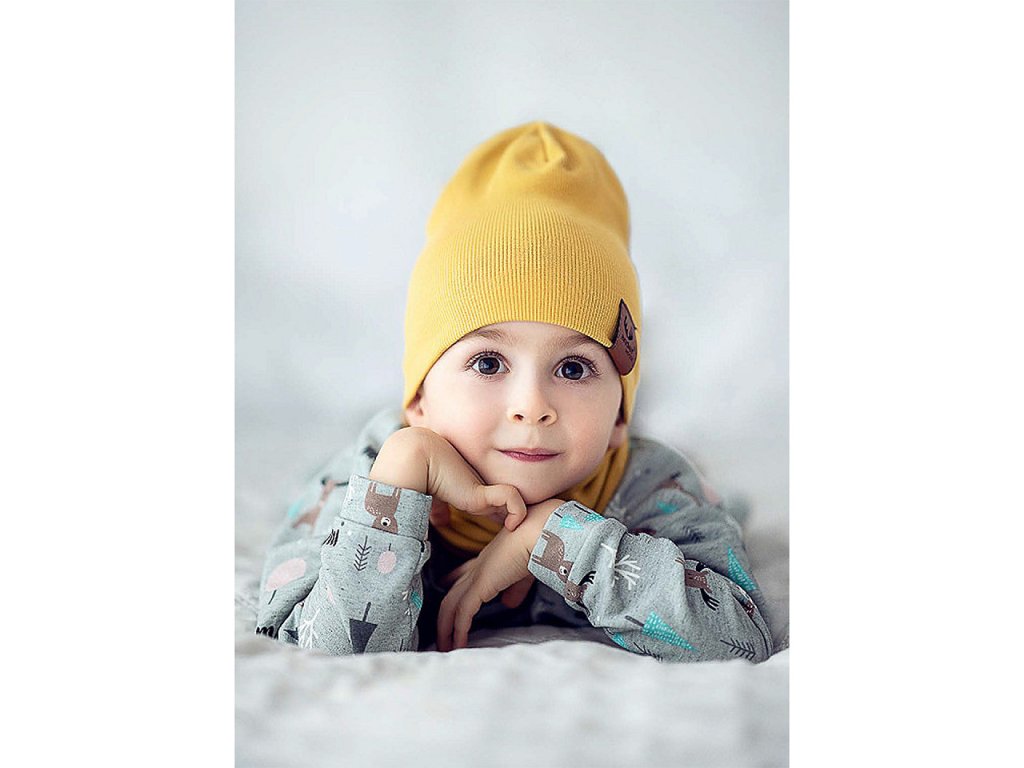 Dětská bavlněná čepice má delší střih. Hodí se na běžné každodenní nošení i sportovní aktivity. Čepice je dvojitá, bude hřát už od podzimu. Na boku má lem ozdobený koženým štítkem. Volně položený obvod lemu je 36 cm, natažený až 54 cm. Výška čepice je 22 cm.- Výška: 22 cm