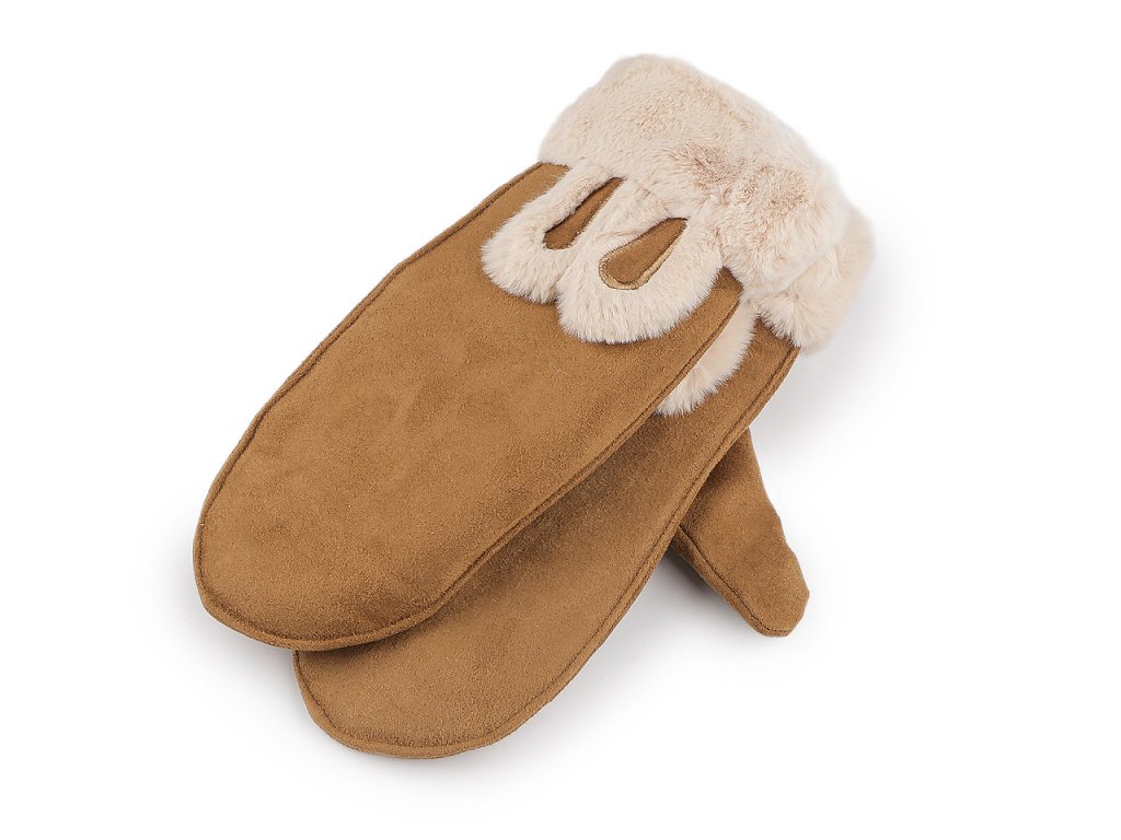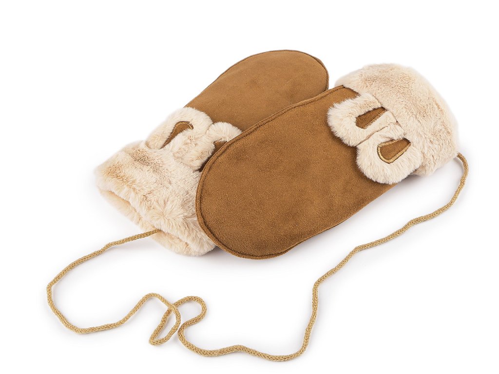 Dětské rukavice palčáky mají na horní straně hravý prvek v podobě králičích oušek a kožešinového lemu z umělé kožešiny. Povrch rukavic připomíná broušenou kůži. Uvnitř jsou zateplené příjemným plyšovým kožíškem. Hodí se do zimy, dětské ruce perfektně zahřejí. Jsou navzájem spojené šňůrou dlouhou 1 metr, která slouží na provlečení rukávy, aby děti rukavice neztratily. Můžete ji odstřihnout pryč. Rukavice doporučujeme pro děti ve věku 8 - 12 let. Šířka je měřená na volně položených rukavicích uprostřed (bez palce).- Šířka: 10 cm