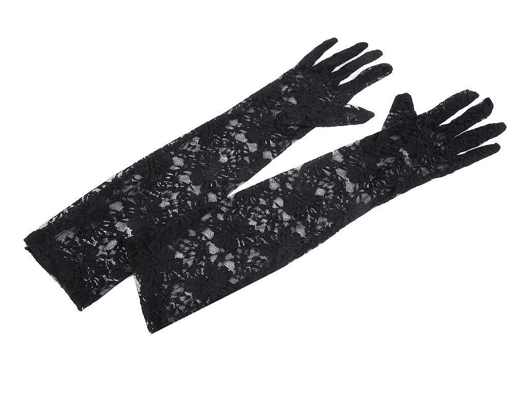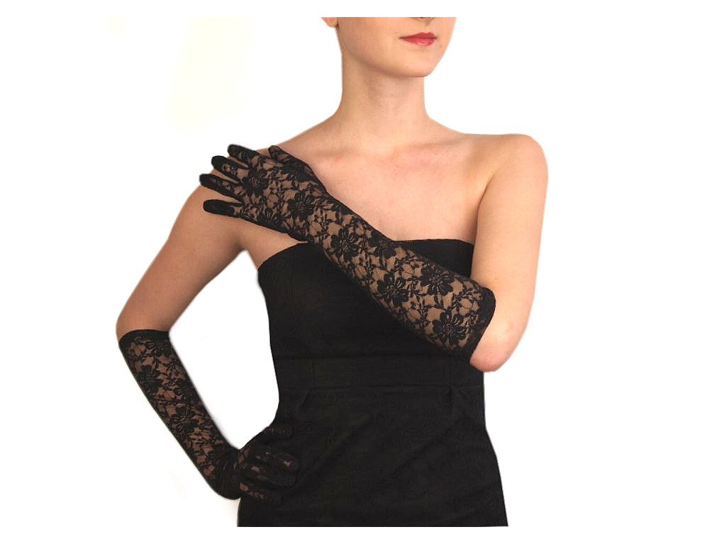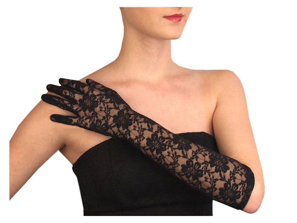 Černé společenské rukavice o délce 43cm s krajkovým vzorem. Na dotek jsou velmi příjemné, jsou elastické a lehce se přizpůsobí ruce své majitelky. Dlouhé rukavice navíc zeštíhlují postavu. Budete glamour a užijete si kouzelné večery. Pokud zvolíte jednoduché šaty, doplníte je těmito rukavicemi a štrasovou bižuterií, budete nepřehlédnutelná.- Délka: 43 cm