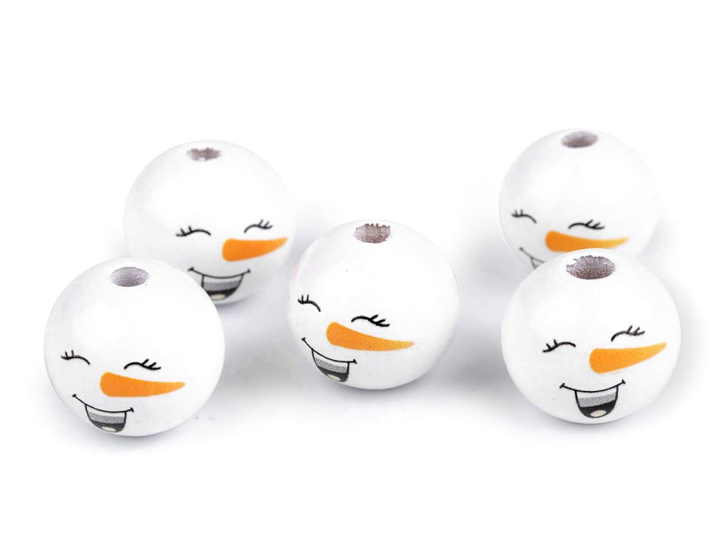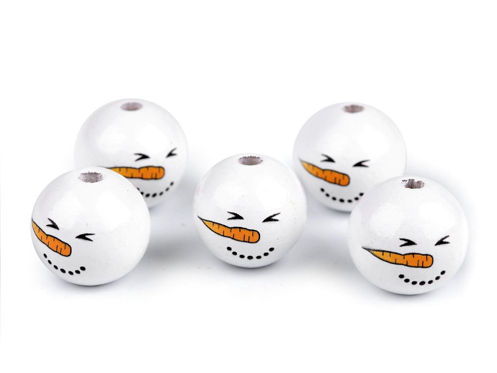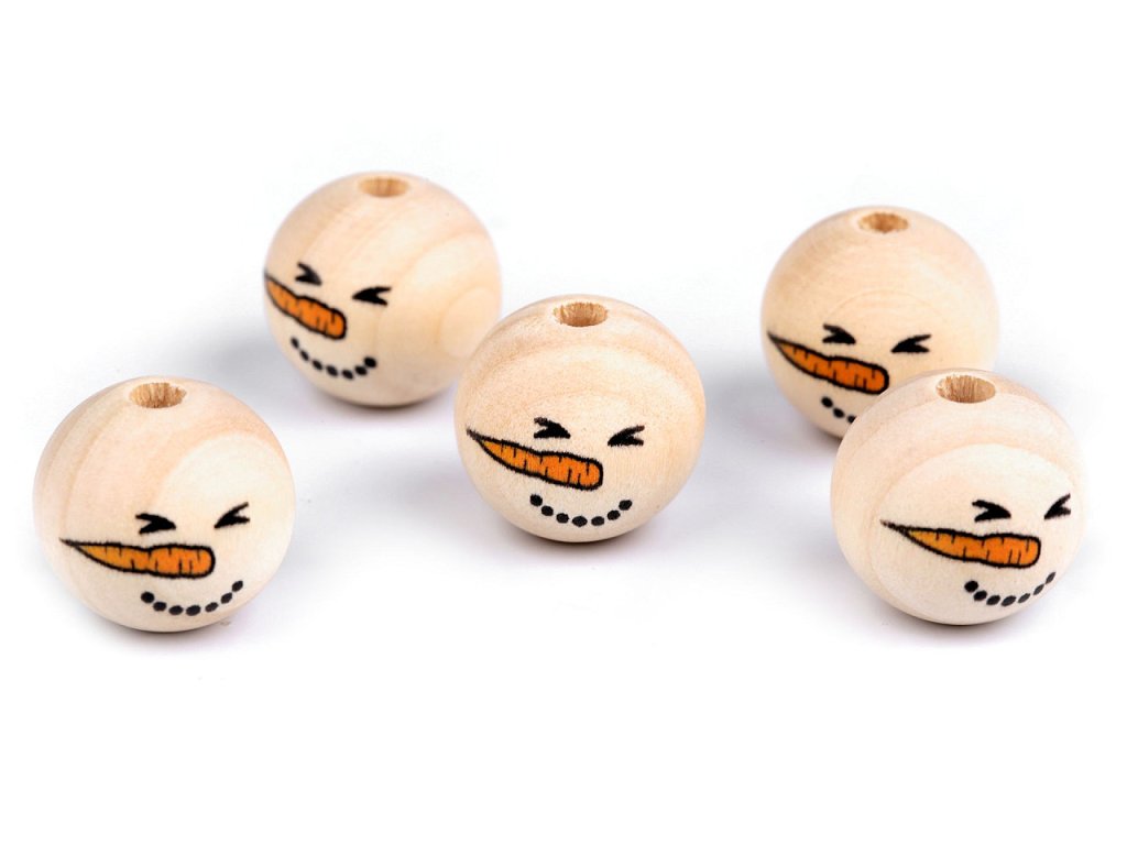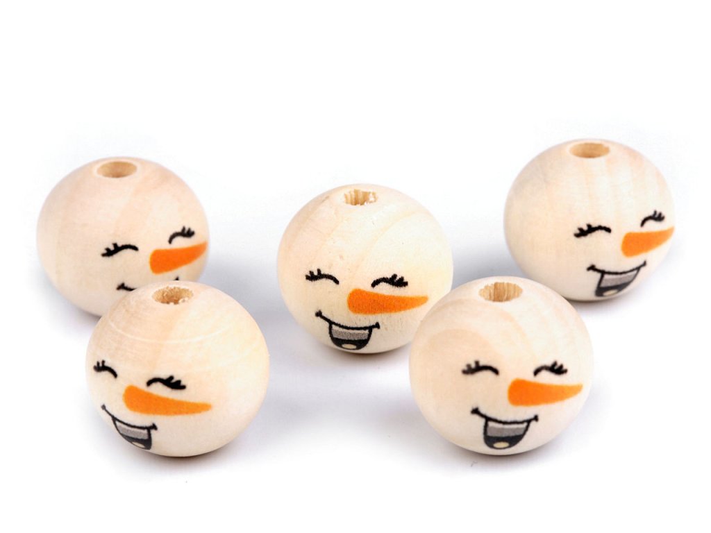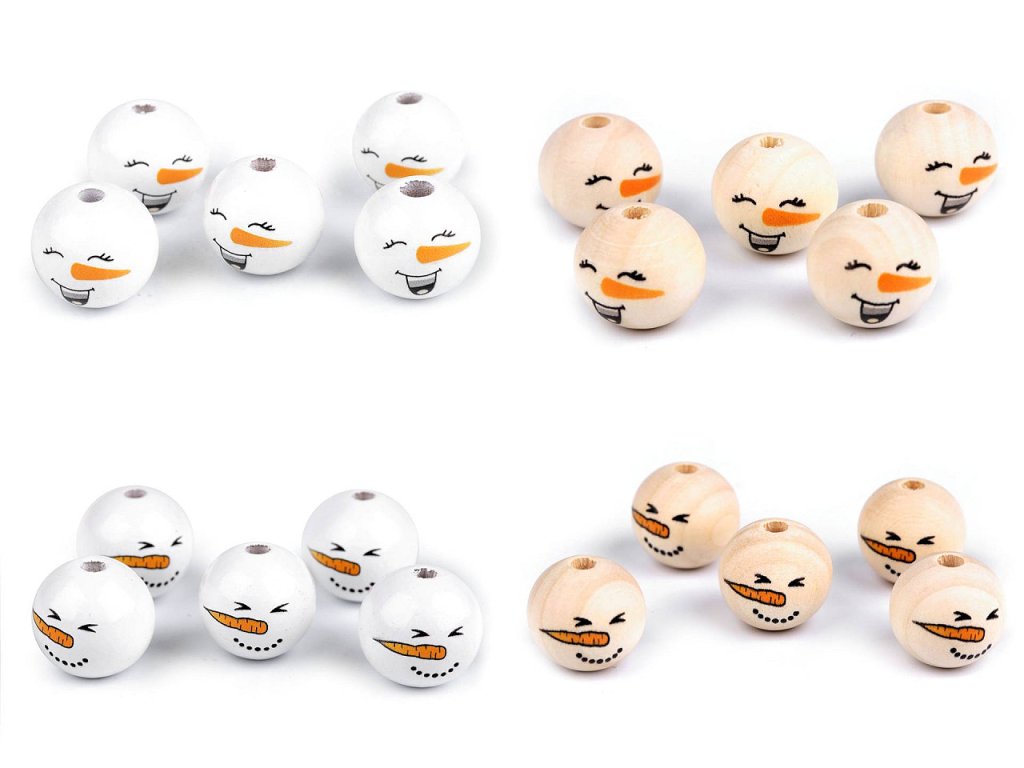 Dřevěné korálky s malovaným obličejem sněhuláka. S jejich pomocí si můžete vytvořit postavičky, vytvořit veselý náhrdelník, vyrobit prstové maňásky, veselé zápichy do květináče apod. Díky malbě se od sebe jednotlivé korálky mohou lišit. Může se lišit i kresba dřeva, včetně barvy. Vzhledem k technologii zpracování dřeva mohou být okolo průvleků otřepky. Obličej je na přední straně korálku, zadní strana je bez malby. Korálky č.1 a 3 se díky laku jemně lesknou, korálky č.2 a 4 jsou přírodní.- Průměr: 20 mm