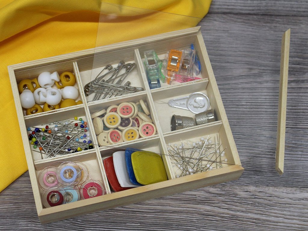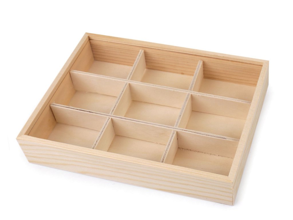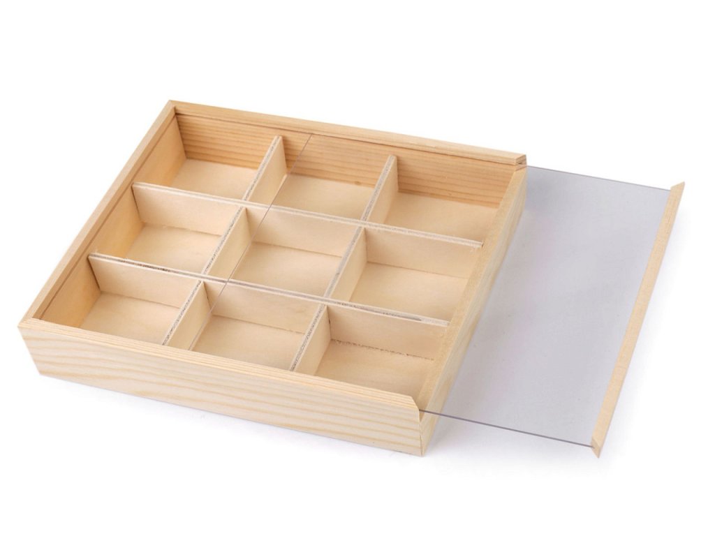 Do dřevěné krabičky se zasouvacím průhledným víkem můžete uložit drobný materiál na vaše kreativní tvoření. Hodí se na korálky, knoflíky, bižuterní materiál apod. Najde využití i jako organizér v domácnosti, do skříně, šuplíku apod. Přihrádky se dají odejmout. Velkou výhodou je, že si krabičku můžete dozdobit dle svého vkusu. Rozměry složených přihrádek jsou cca 4 x 5 cm.- Rozměry: 13,5 x 17 cm
