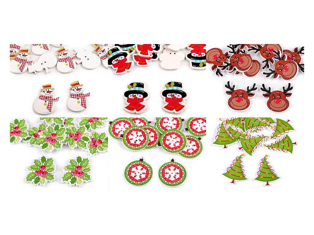 Dřevěné dekorační knoflíky s vánočními motivy. Na první pohled vás zaujmou svým detailním barevným potiskem. Knoflíky využijete k aranžování např. svátečního stolu. Můžete je nalepit na dřevěné kolíčky. Využijete je také ve scrapbookingu, kde s nimi můžete ozdobit rámečky, přáníčka, jmenovky, pozvánky, deníky apod. Potisk je jednostranný, z druhé strany jsou knoflíky bílé. Knoflíky jsou baleny v sáčku. Nedoporučujeme je prát.- Rozměry: 22 - 40 mm