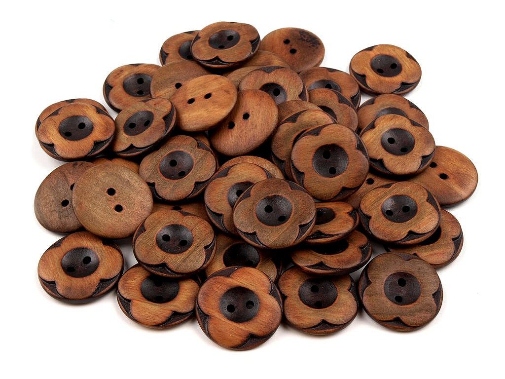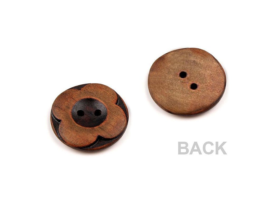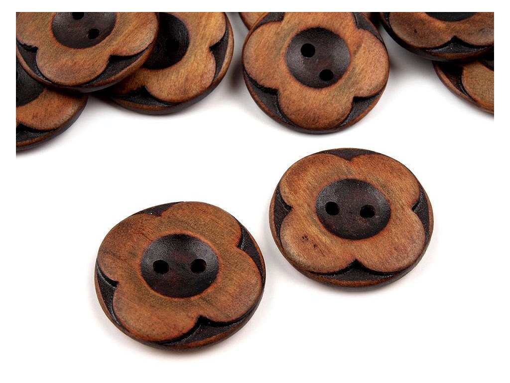 Dřevěné knoflíky kulatého tvaru zdobí vyřezávaný květ. Knoflíky využijete nejen jako zapínání na oděvy a doplňky, ale také na scrapbooking. Můžete s nimi ozdobit krabice, alba na fotky nebo různá přáníčka. Knoflíky jsou baleny v sáčku. Velikost knoflíků naleznete v této tabulce. Knoflíky nedoporučujeme prát.- Průměr: 25 mm