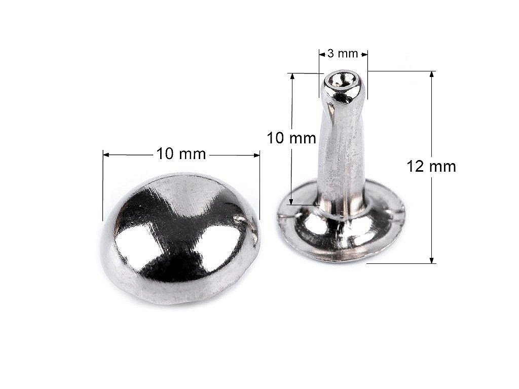Půlkulatý nýt se skládá ze dvou částí. K jeho aplikaci je potřeba piston, který najdete pod kódem 780038 a lis. Nýty využijete k výrobě kabelek, opasků, peněženek, náramků atd. Zajímavě ozdobí i boty a kožené bundy.- Průměr: 10 mm